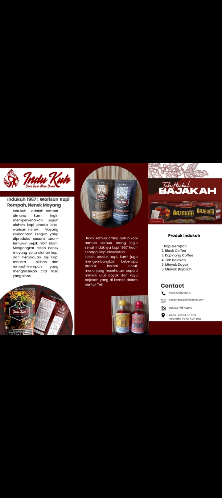 Indu Kuh Coffee 1957, warisan kopi lokal khas Kalimantan Tengah yang lahir dari tradisi turun temurun sejak 1957. Kami menyajikan Kopi Rempah Dayak, Kopinang Coffee, Black Coffee, dan Teh Bajakah dengan racikan khas leluhur Dayak yang kaya akan cerita, rasa unik, dan manfaat kesehatan. Setiap seduhan membawa kisah warisan kopi Indonesia, dedikasi pada kualitas, dan tradisi abadi. Indu Kuh Coffee 1957 bukan hanya kopi, tapi simbol kebanggaan dan semangat melestarikan kekayaan kopi lokal Indonesia dengan citarasa klasik dan unik, menjaga warisan leluhur untuk generasi mendatang.