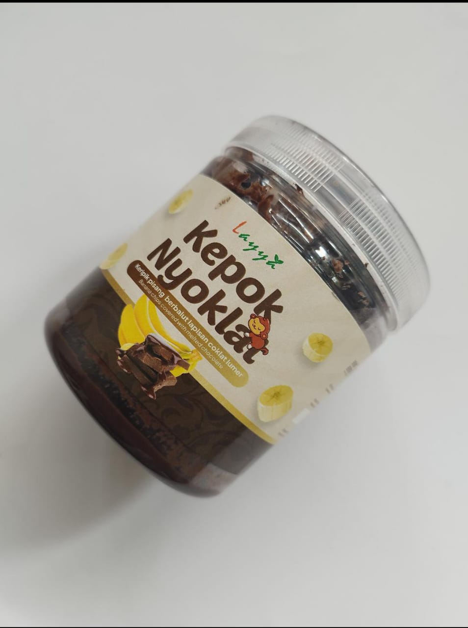 keripik pisang kepok dgn sensasi aneka rasa coklat, tiramisu, matcha yg lumer di kemas menggunakan toples plastik