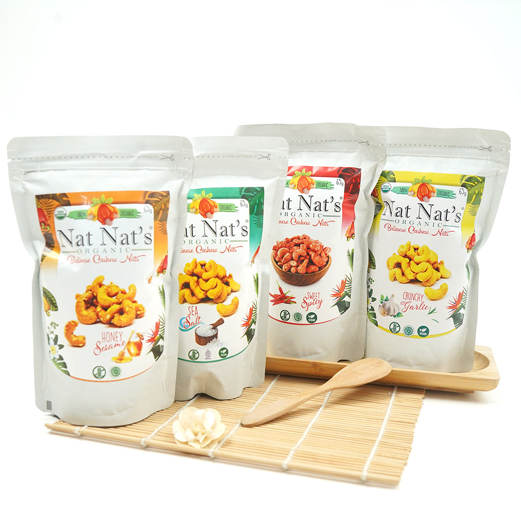 Nat Nat’s Cashew Nut merupakan cemilan enak yang menggunakan kacang mete pilihan dan kualitas terbaik dari perkebunan sendiri, diproses melalui quality control sesuai standar hingga menghasilkan kacang mete yang enak, renyah, dan sehat. Tidak menggunakan pemanis, perasa, hingga pengawet.