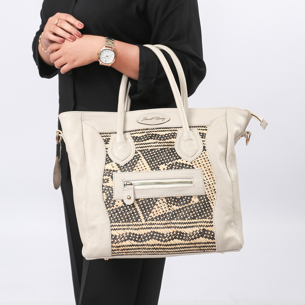 bahan kulit asli kombinasi dengan motif anyaman rotan dare ihing dan dare handipe uru