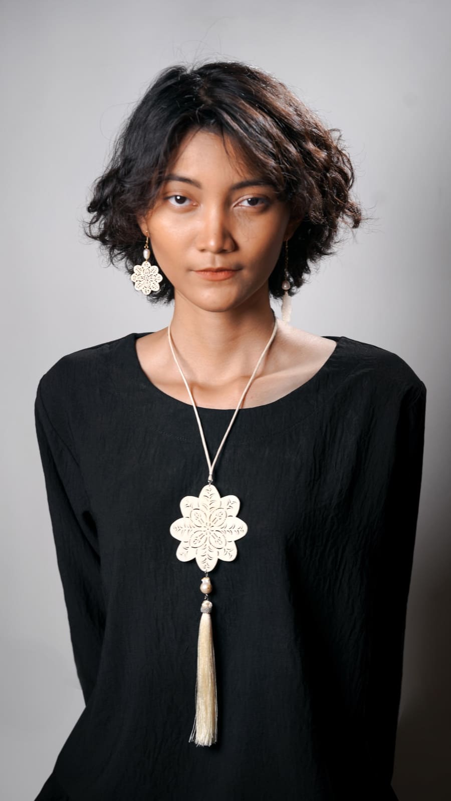 Bahan : kulit perkamen, batu alam, mutiara air tawar, dan stainless steel.