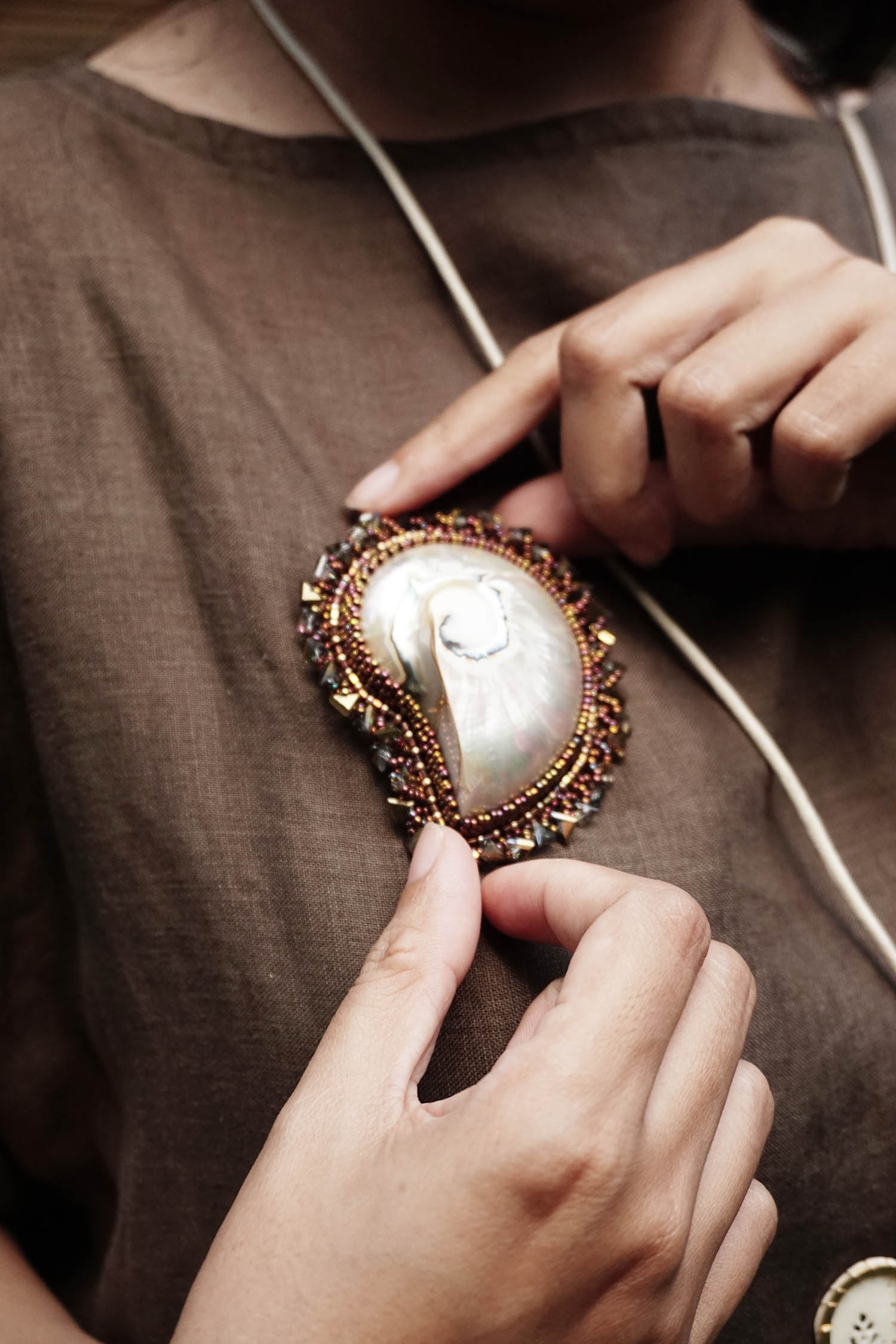 "Nautila", terinspirasi dari bentuk kerang laut. Bentuk tersebut melambangkan kekayaan biota samudra. Dibuat oleh Artisan Joglo Ayu Tenan dengan menggunakan teknik embroidery.