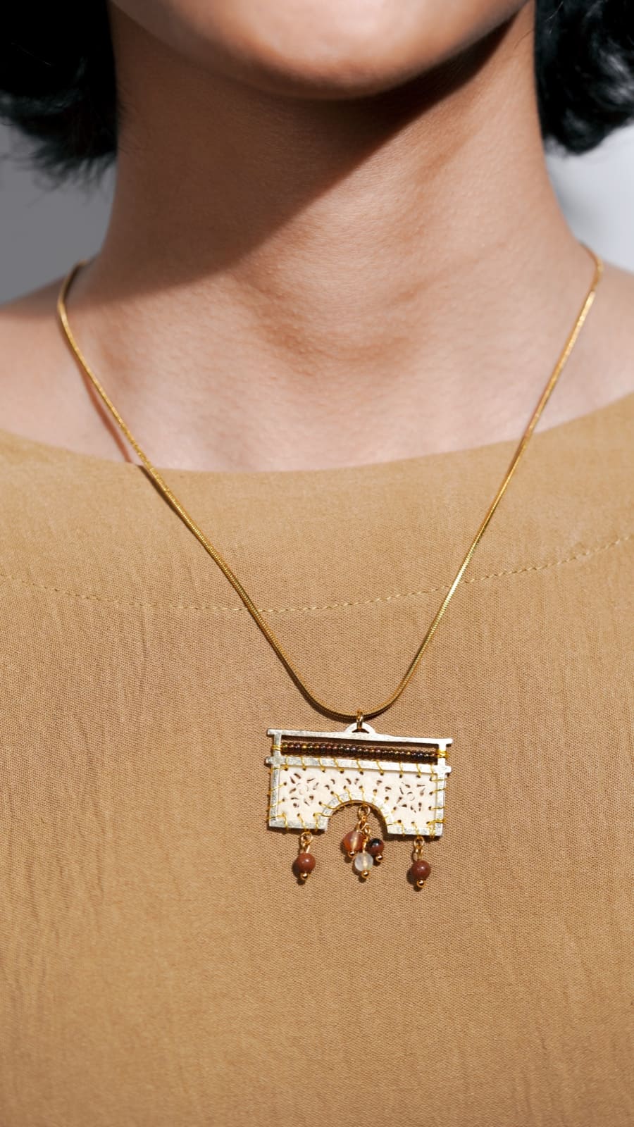 Terinspirasi dari salah satu Sumbu Filosofi Yogyakarta, Panggung Krapyak. Tempat ini digunakan sebagai tempat berburu oleh keluarga kerajaan pada musim berburu. Karya ini dibuat dari kulit perkamen dengan teknik tatah sungging (ukiran kulit) tradisional, yang dihiasi dengan manik-manik dan dijahit pada bingkai logam kuningan. Kami berkolaborasi dengan Ibu Wagiyem, pengrajin tatah sungging, dan Pak Tejo, pengrajin logam.