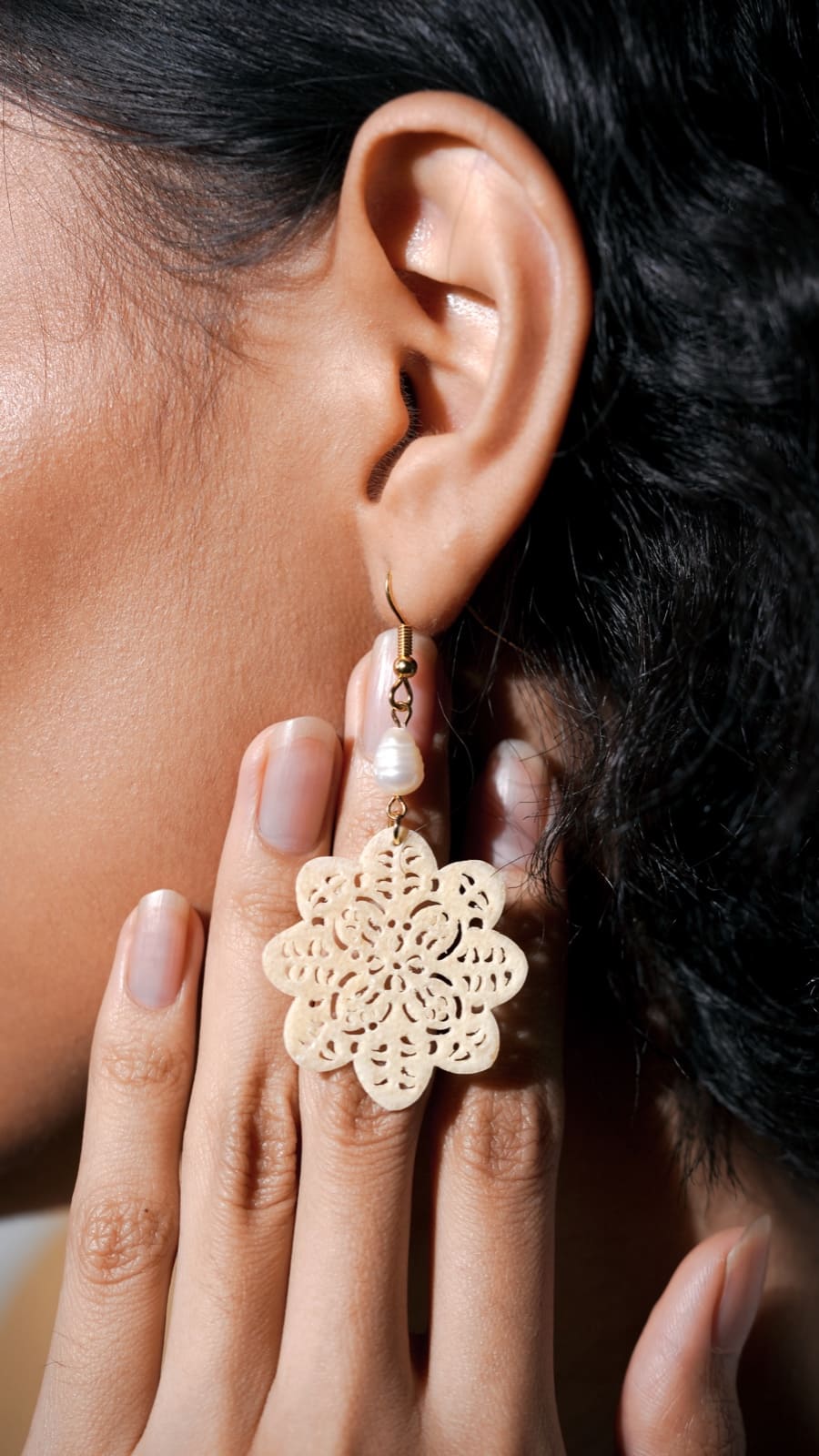 Jenis Bahan: parchment leather, natural stone, freshwater pearls, and stainless steel.