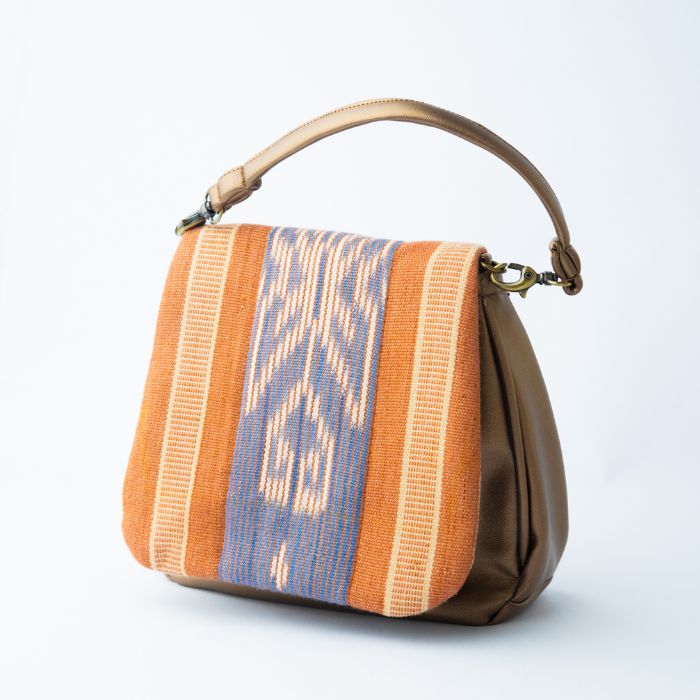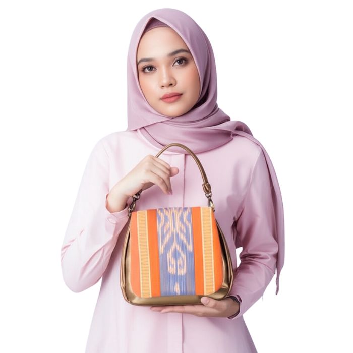 Desain Handbag Ina ini dibuat ekslusif menggunakan Tenun Ikat Tanimbar khas Maluku yang benangnya menggunakan pewarna alam yang berasal dari lokasi sekitar Penenun tinggal.