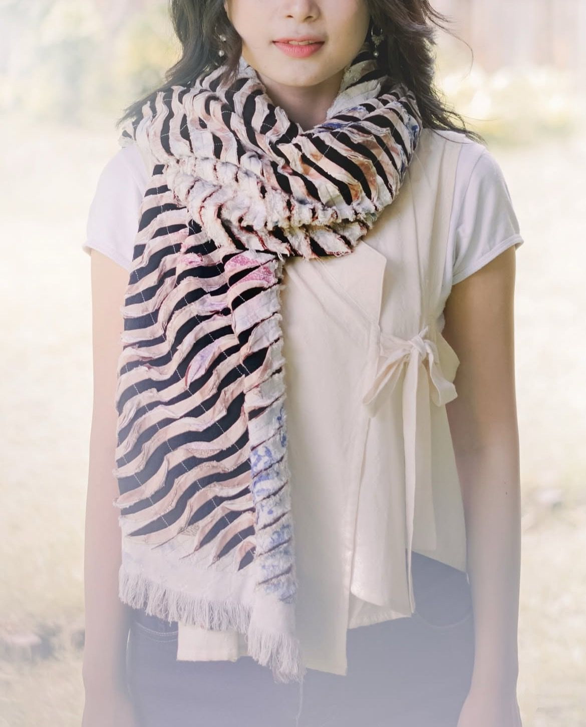 Makna Motif: Effortless style in every fold. Our fabric manipulation scarf elevates your everyday look with its rich dimension and soft drape - crafted using our signature fabic manipulation technique from repurposed cut-offs. Back by popular demand, this favorite piece is now restocked and available in a range of beautiful color shades. A look that speaks sotly, but with meaning.