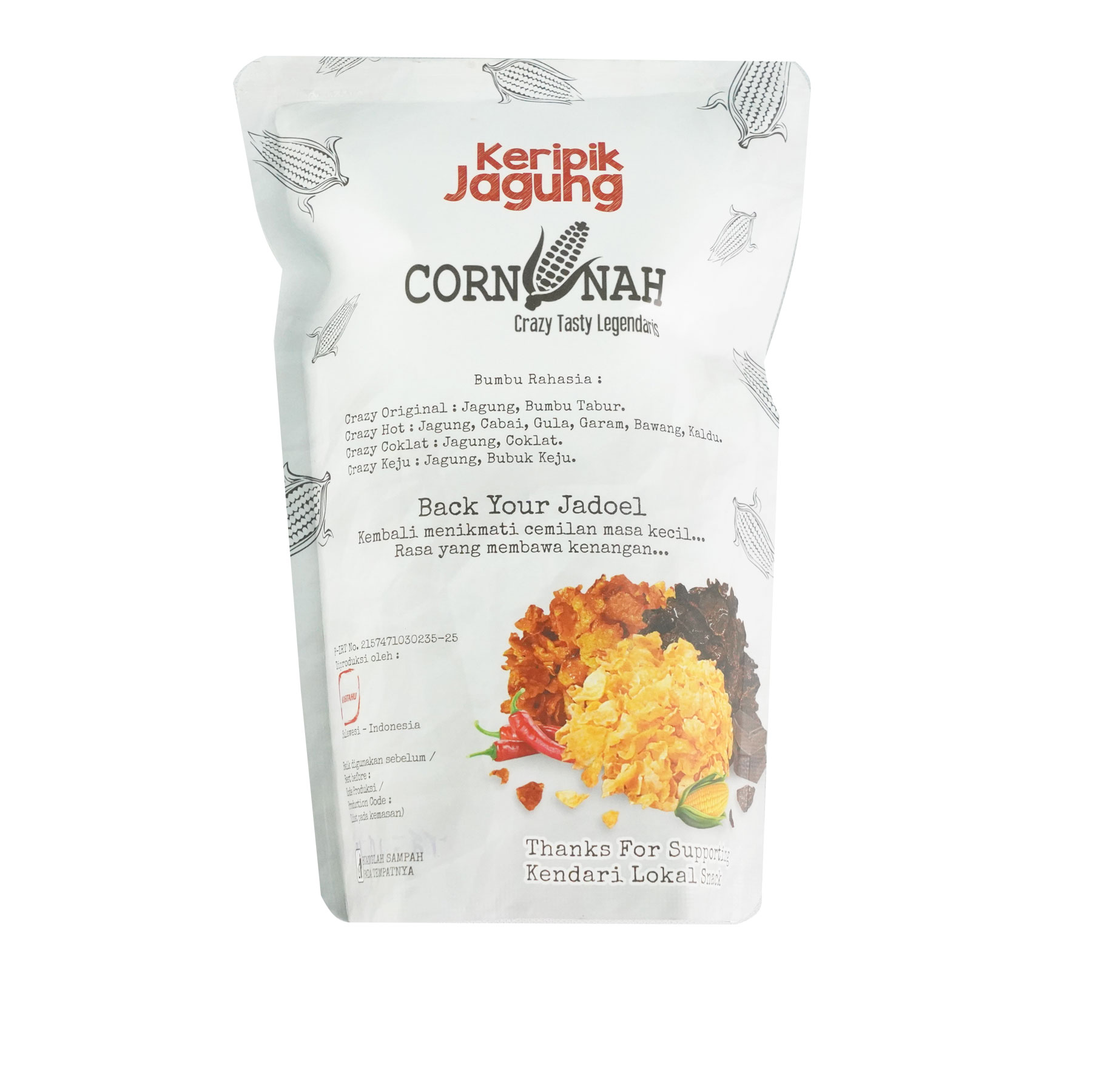 Keripik jagung cornnah merupakan keripik dari bahan baku jagung utuh yang dipipihkan. Dan memiliki varian legend seperti pedas dan original asin serta varian kekinian yaitu coklat dan keju.