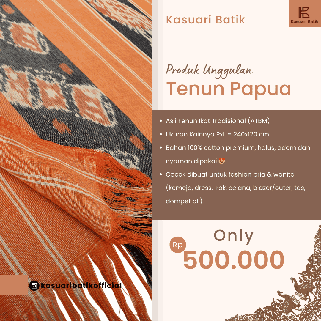 Makna Motif: Tenun ini menggambarkan keunikan Burung Kasuari yang merupakan icon Daerah Papua Barat. Selain itu, terdapat motif Tifa Papua yaitu alat musik tradisional Suku Papua yang menghiasi kain wastra ini.
