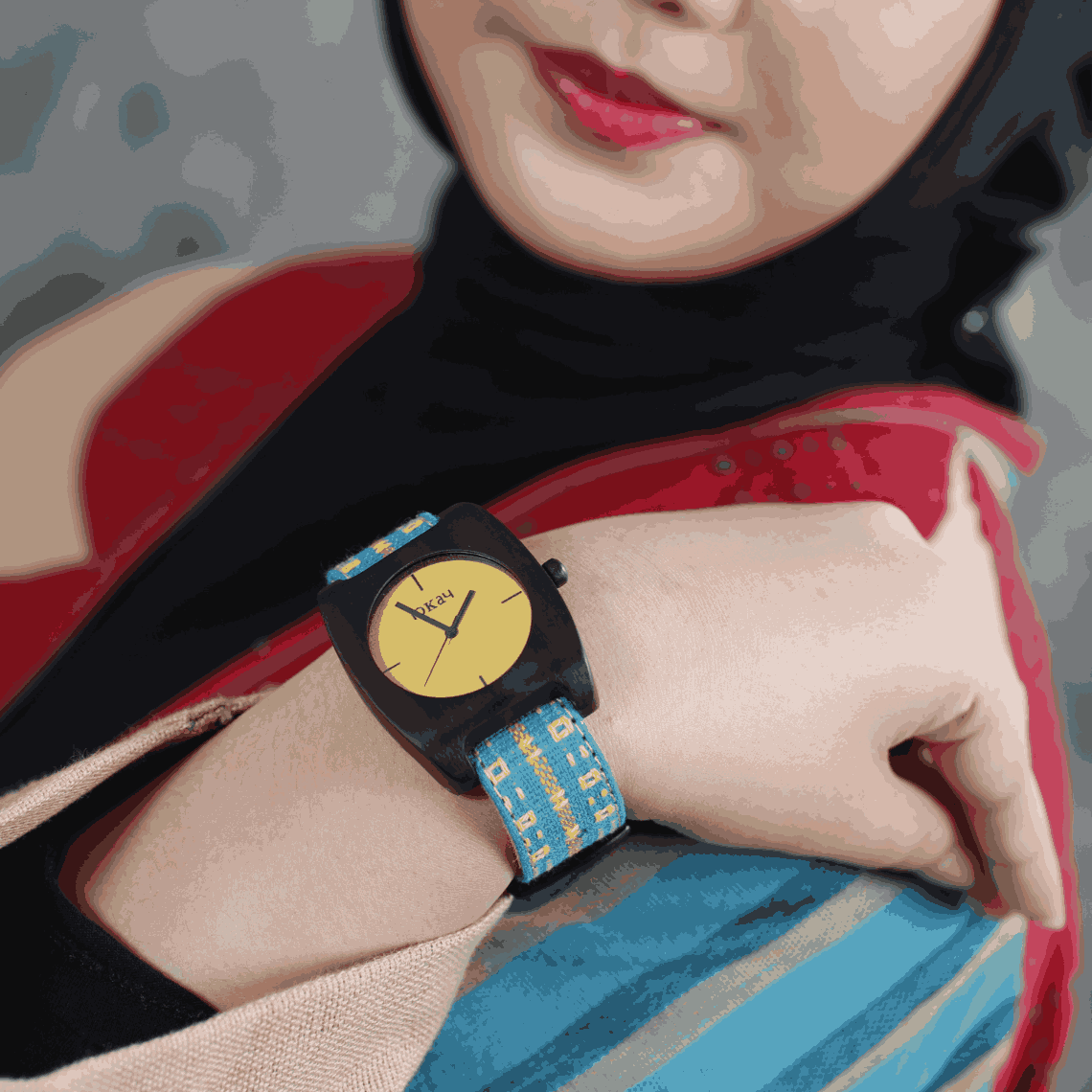 Tenun : Tenun yang digunakan adalah tenun baduy dengan, motifsuat songket, dengan salur benang berwarna hijau dan juning, senada dengan background dial, memberikan efek yang dinamis dan sporty look.