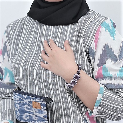 Rangkaian batu kecubung yang dikombinasikan dengan kristal dan payet jepang yang di jahit 1 persatu dengan teknik Cabochon Beadembroidery. Rantai gelang dari batu bulat kecubung bulat dan kristal