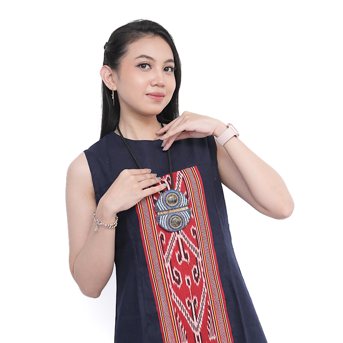 Jenis Bahan: Syal tenun ikat Sintang, batu alam Labrador, kristal, payet, lapisan belakang kulit sintetis tebal, peniti dan rantai kalung kulit sintetis.