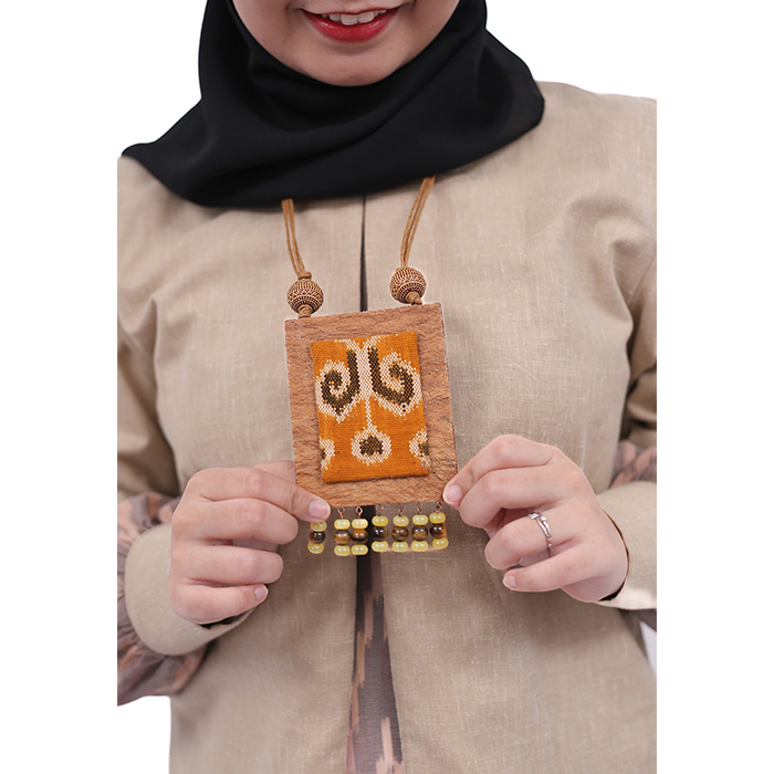 Kalung Etnik bentuk persegi panjang kombinasi dari kulit kayu kapuak, tenun ikat Sintang dan batu alam bulat. Tali dari kulit dan mote