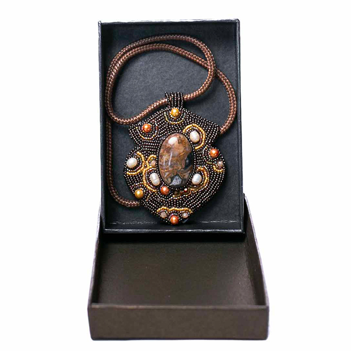 Kalung elegan dari batu alam Fosil, kristal, Mutiara air tawar dan payet Jepang, dibuat dengan teknik cabochon bead embroidery. Dihiasi mote dan kristal yang dijahit satu per satu dengan benang khusus beading sono dan finishing kulit sintetis tebal. Bentuk mata kalung yang unik dan kombinasi warna senada memberikan desain yang elegan. Hindari parfum atau body lotion, dan anginkan selama 5 menit setelah digunakan. Tampil menawan dengan kalung yang memadukan keanggunan dan keunikan