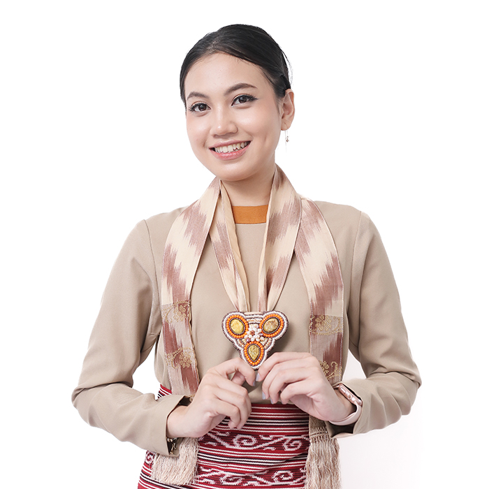 Jenis Bahan: Syal tenun songket Sambas, batu alam Druzy, mutiara air tawar, kristal, payet, lapisan belakang kulit sintetis tebal, peniti dan rantai kalung kulit sintetis.