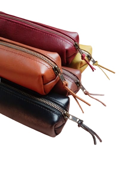 tempat pensil dari bahan kulit sapi asli, dijahit manual tangan dengan teknik saddle stitch, sebuah teknik jahitan yang dikenal kuat serta rapi dan hanya bisa dikerjakan manual.