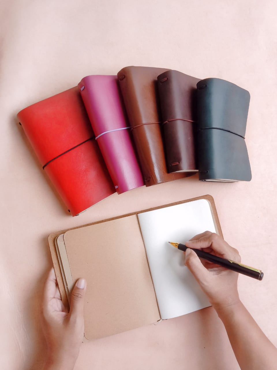 jurnal untuk menemani perjalanan maupun aktifitas harian, dengan sampul kulit sapi asli dan isian yang bisa diisi ulang. untuk keperluan souvenir korporat, tersedia layanan penambahan logo perusahaan ataupun nama di tiap jurnalnya, beserta hard box dengan custom logo perusahaan.