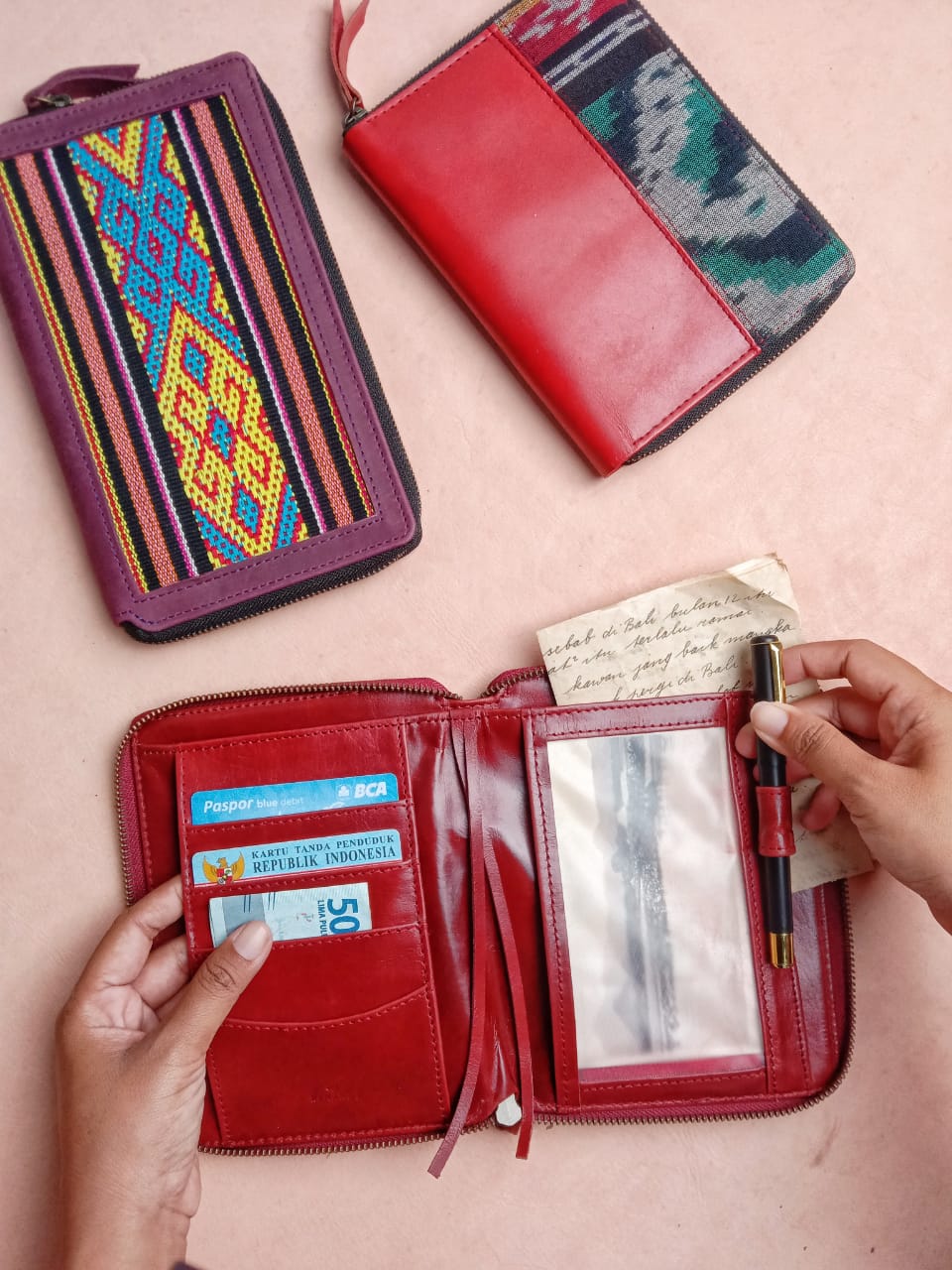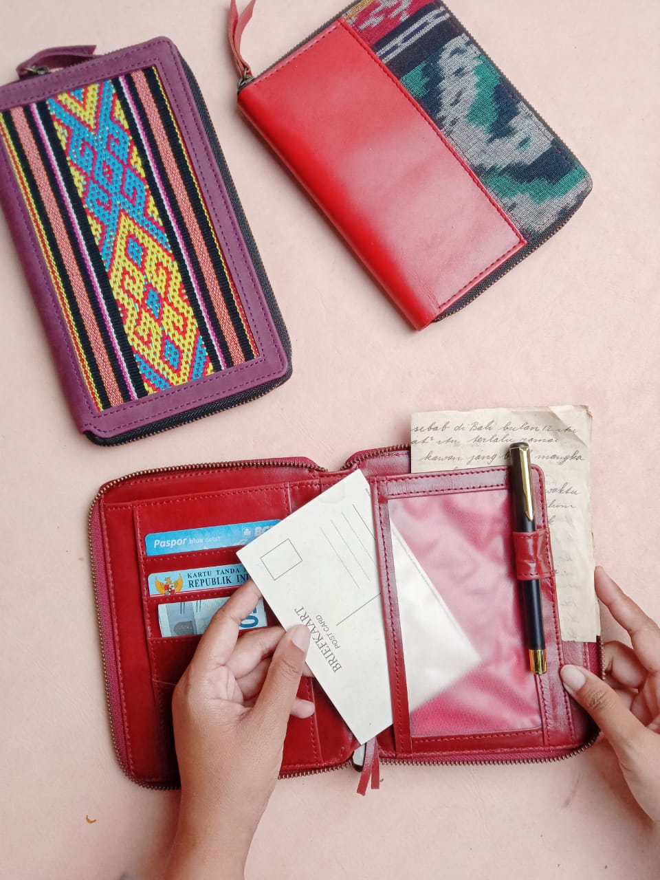 organizer sebagai berbahan kulit sapi asli berpadu dengan kain dari nusa tenggara.