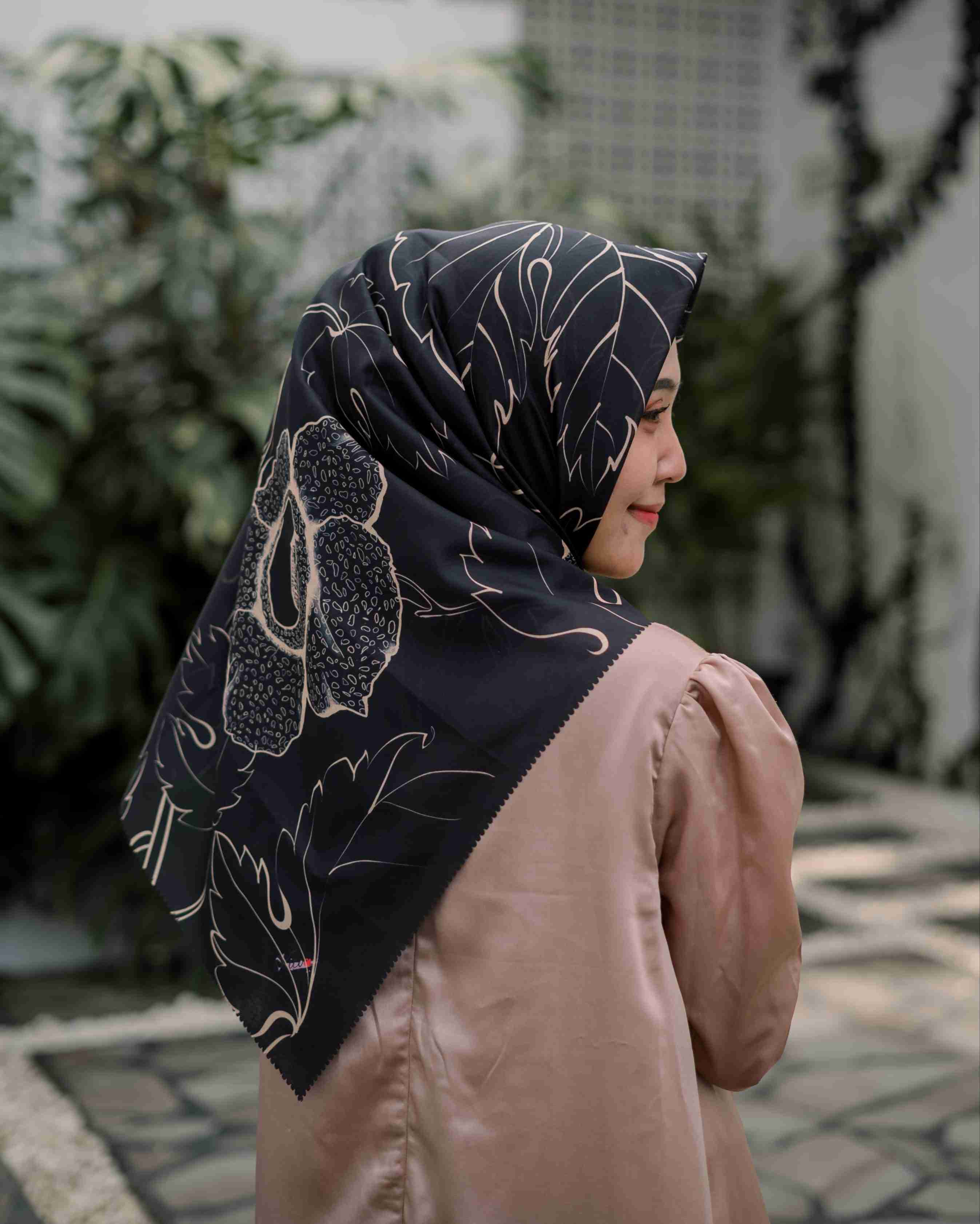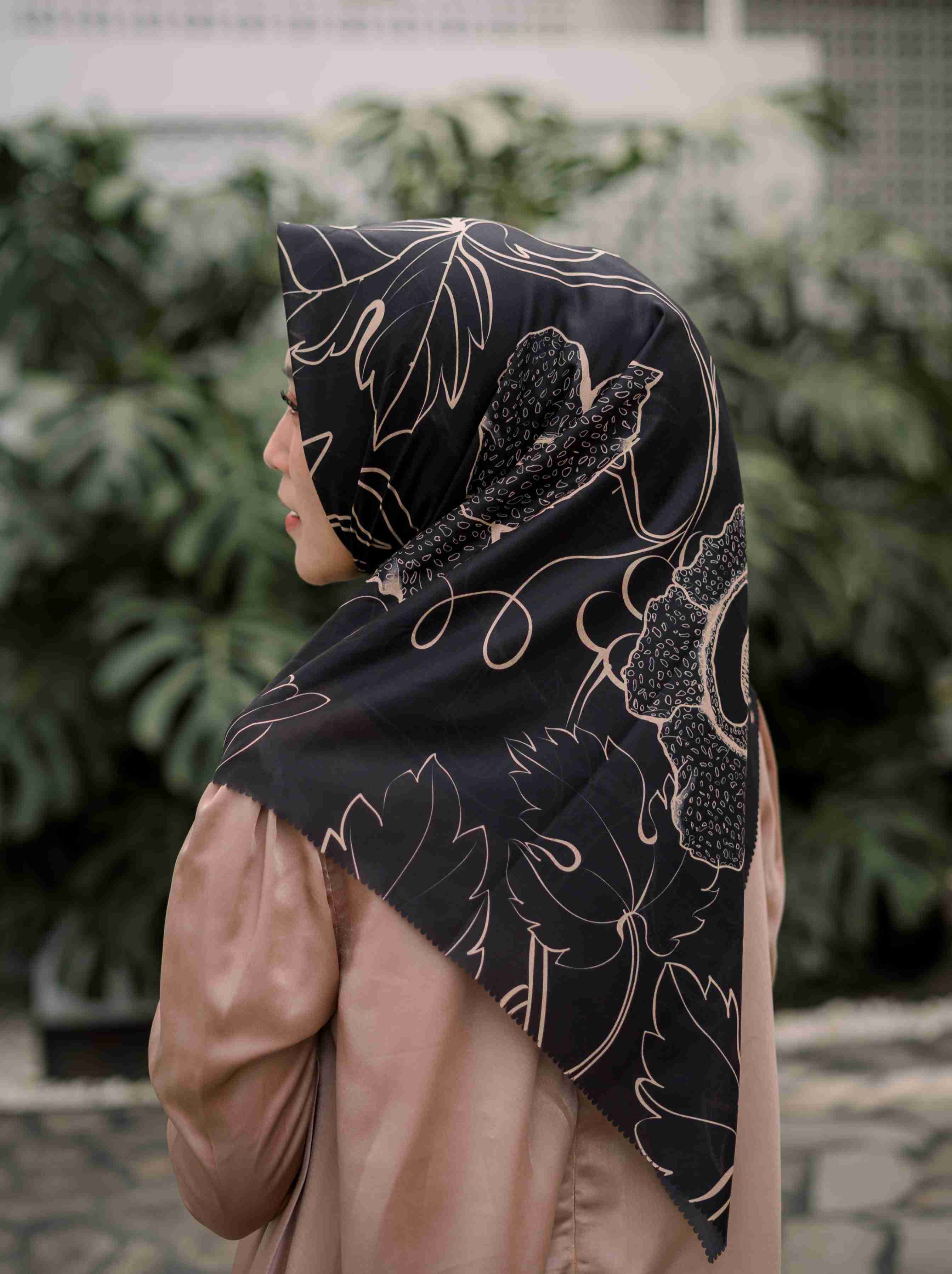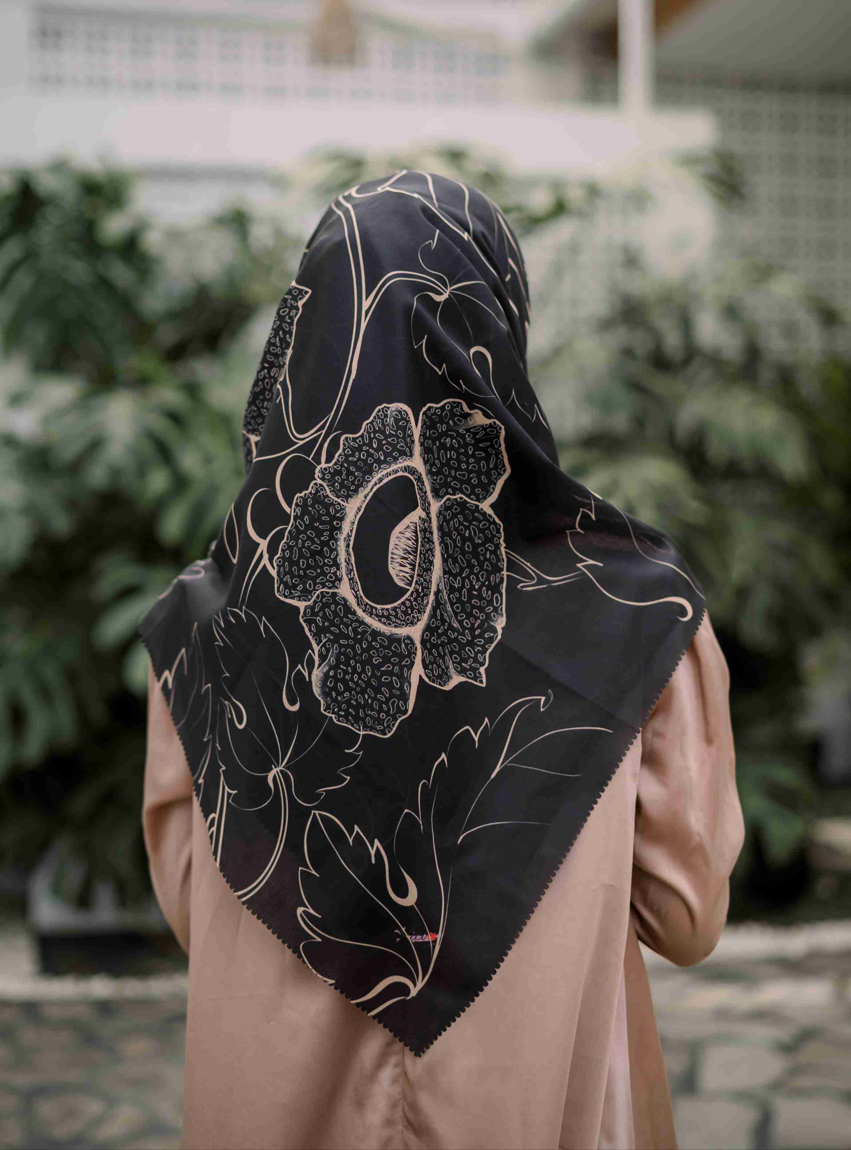 Makna Motif: Scarf bermotif bunga Rafflesia dengan perpaduan warna hitam dan gold memang tidak pernah gagal untuk memberikan kesan elegant dan hangat.