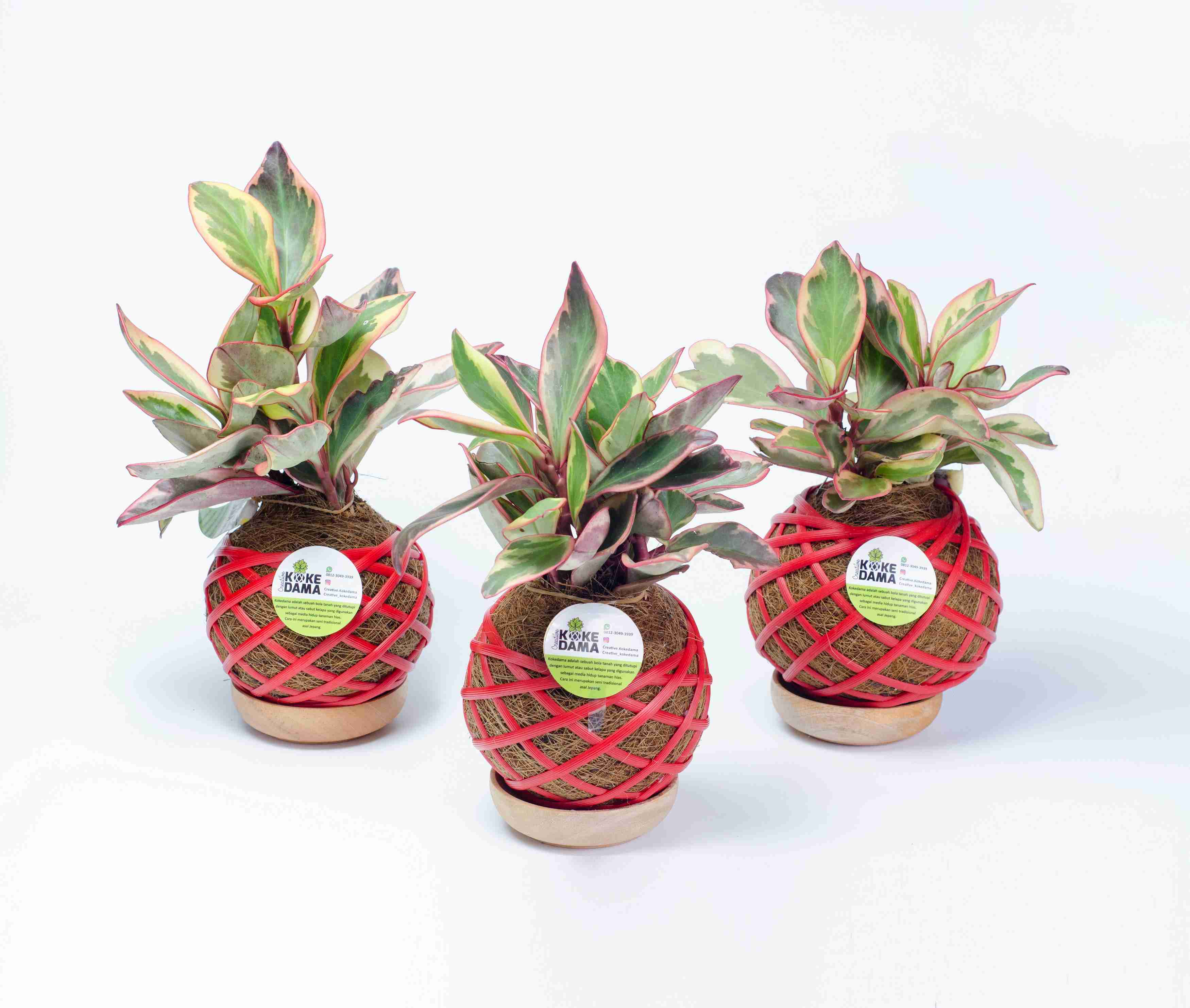 Jenis Bahan: Tanaman hias yang medianya dibentuk bola dan dibalut dengan serabut kelapa (teknik kokedama)