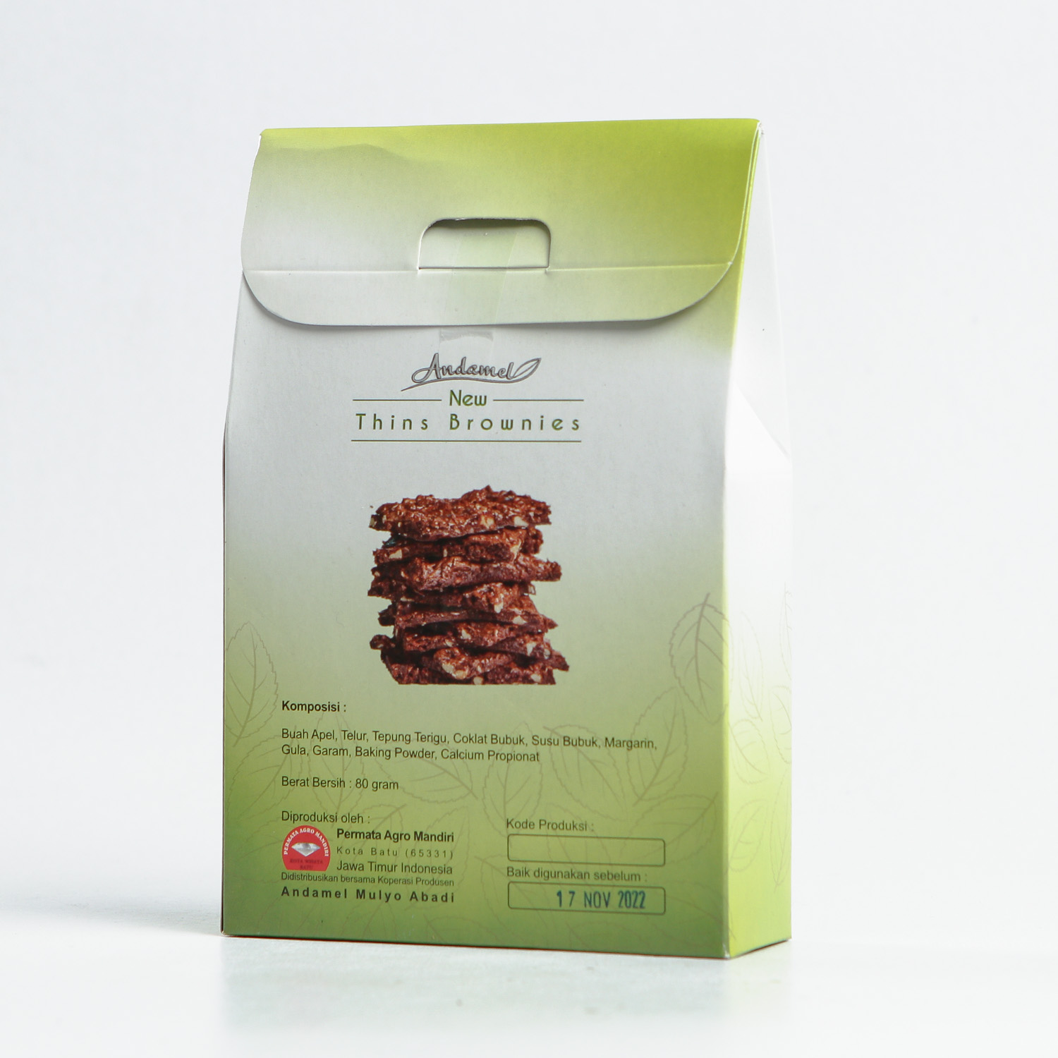Kandungan Bahan: Buah Apel, tepung terigu, gula, telur, dark cooking chocolate, coklat bubuk, susu bubuk, margarine, garam, pengawet calsium propionat