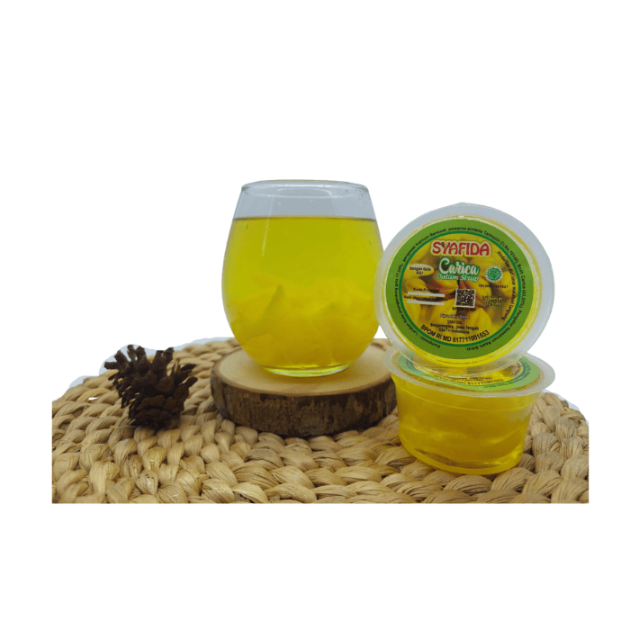 Kandungan Bahan: Buah Carica, Larutan Gula (mengandung gula 17,24% , pengawet Natrium Benzoat, Pewarna Sintetis Tartrazin, Pengaturan Keasaman Asam Sitrat)