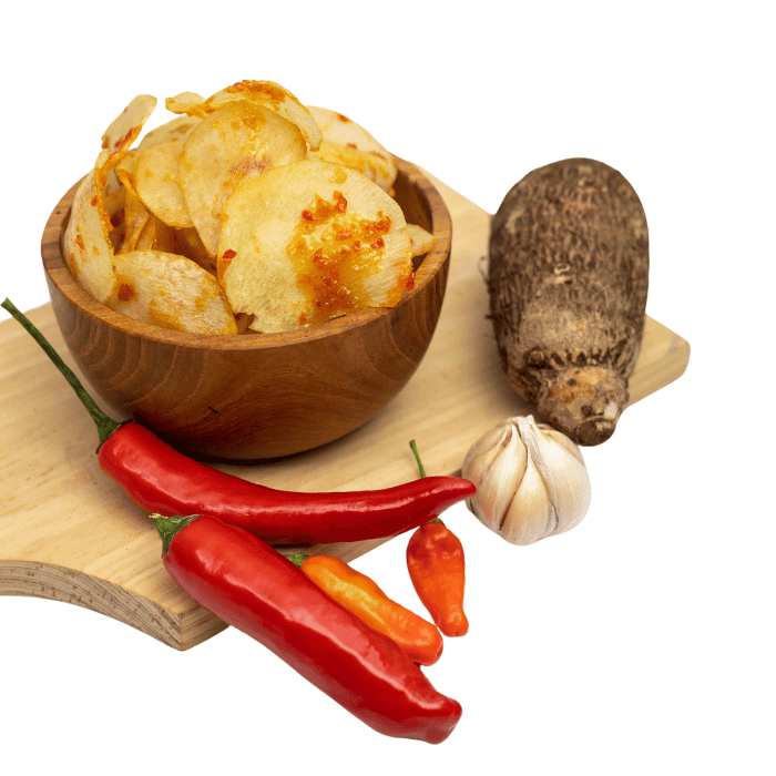 Karangasem memiliki daerah perbukitan dengan tanah berpasir dan kadar air yang cukup untuk talas tumbuh. Talas yang di hasilkan memiliki tekstur yang legit dan empuk saat di goreng. Mendapatkan rasa bumbu yang lebih lekat, dengan campuran cabe, bawang putih, gula dan garam, di padukan secara sedernaha tanpa penguat rasa ataupun penguat warna. memberikan rasa yang lebih lekat dalam kesederhanaan campuran bumbu. KOMPOSISI : TALAS, CABE BESAR, CABE RAWIT, BAWANG PUTIH, GULA, GARAM, MINYAK NABATI. BEBAS GLUTEN, TANPA PENGUAT RASA, TANPA PENGAWET, TANPA PEWARNA BUATAN.