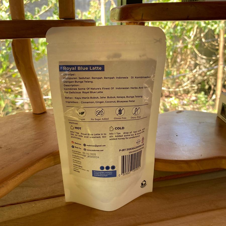Kandungan Bahan: Blue Peas Powder (Bunga Telang Bubuk), Cinnamon Powder (Kayumanis Bubuk), Cardamom Powder (kapulaga Bubuk), Ginger Powder (Jahe Bubuk), Coconut Milk Powder (Kelapa Bubuk)