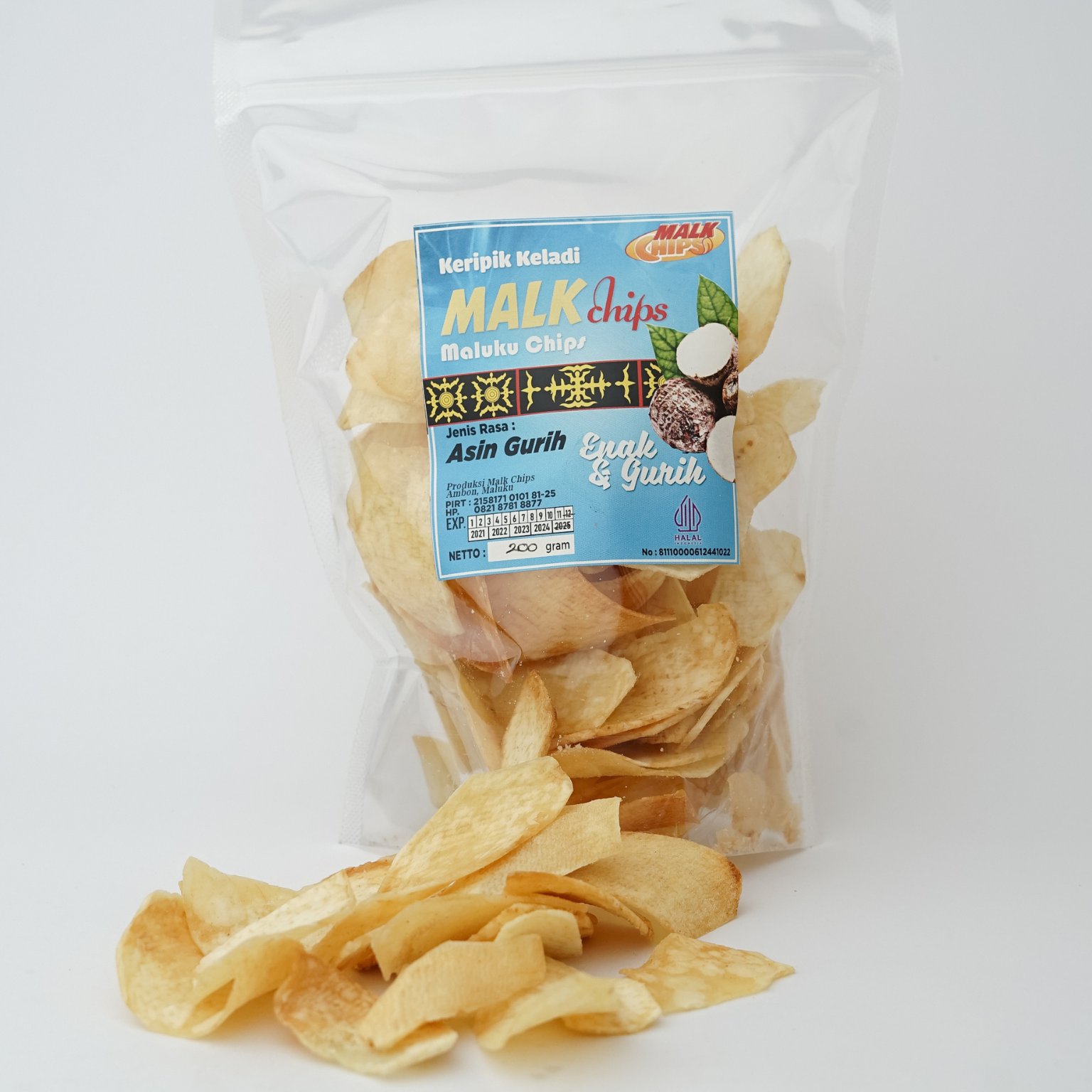 Keripik keladi Malk Chips terbuat dari keladi pilihan tanpa mengunakan pupuk, di proses dengan cara manual dengan peralatan stainless dan tidak mengandung bahan pengawet sehingga aman di kosumsi dari anak – anak hingga dewasa dengan 3 (tiga) Varian Rasa.
