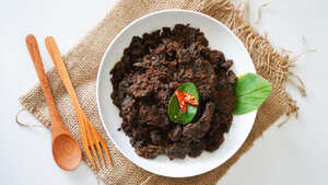 Kandungan Bahan: Daging sapi pilihan, Santan kelapa asli, Cabai Keriting, Bawang merah & bawang putih, Lengkuas (laos), Jahe, Kunyit, Serai, Daun jeruk & daun kunyit, Garam & Gula Merah, Minyak kelapa/minyak hasil rendaman santan