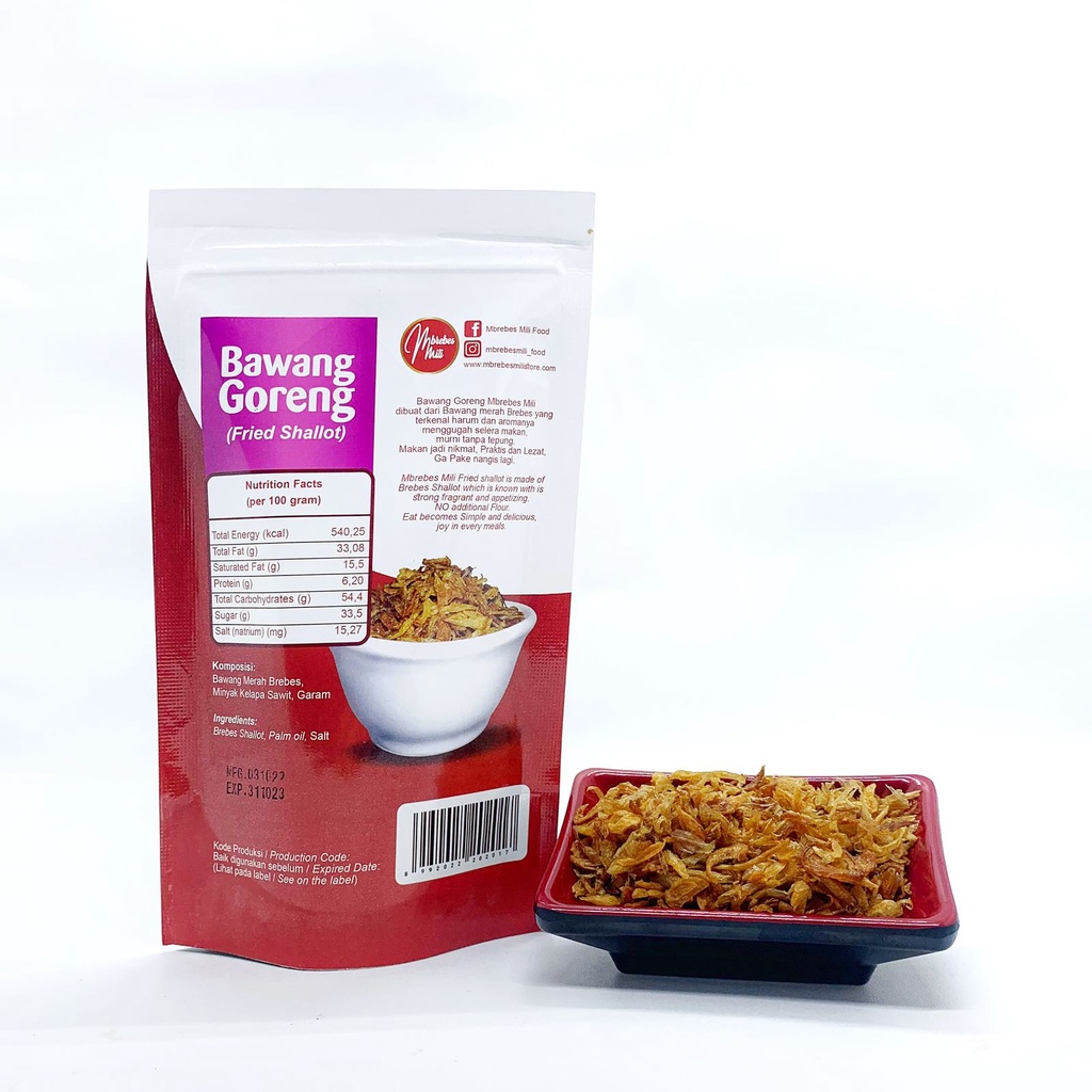 Bawang Merah Goreng Mbrebes Mili dibuat dari Bawang Merah Brebes, asli tanpa campuran tepung, hanya menggunakan garam dan minyak kelapa sawit pilihan, sehingga tercipta bawang goreng yang berkualitas dan otentik, Bawang Merah Brebes terkenal sebagai Bawang dengan aroma yang kuat sangat cocok untuk masakan dan taburan makanan sehingga masakan tambah gurih dan lezat.
