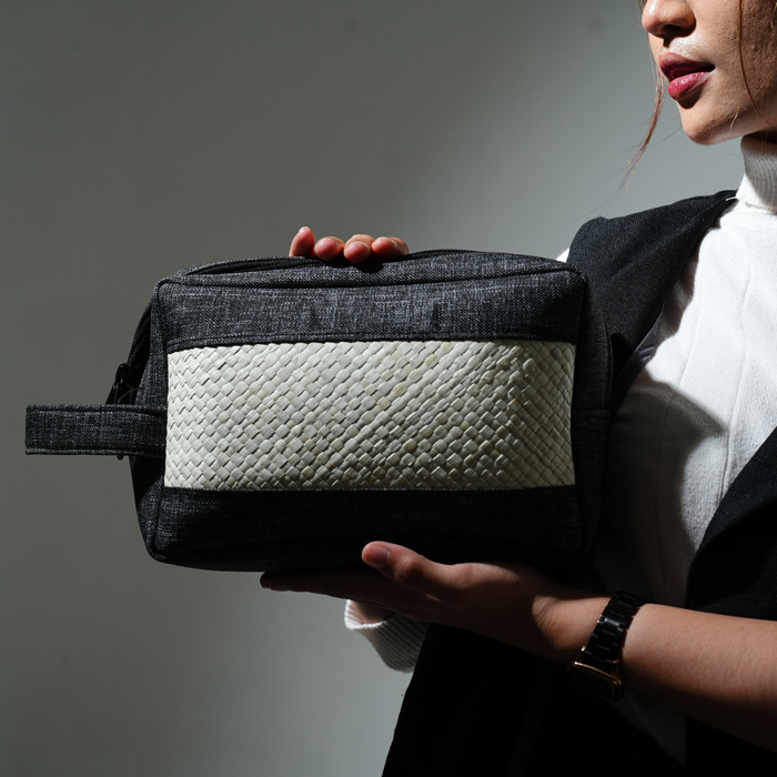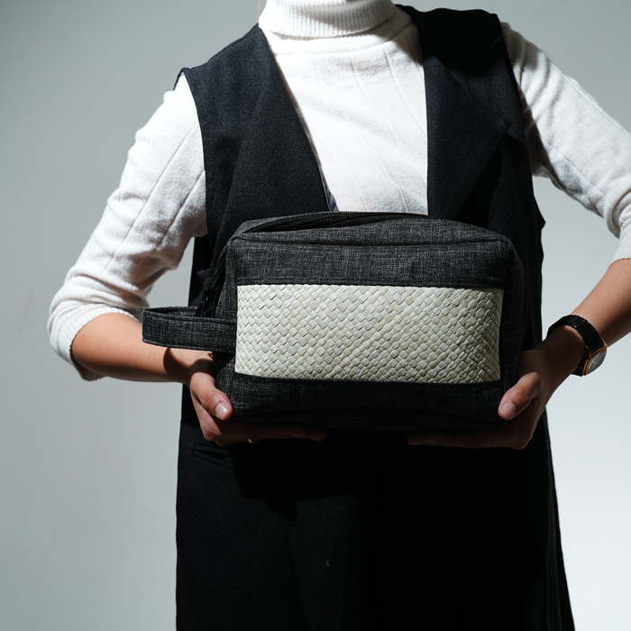 Terbuat dari anyaman daun pandan laut bermotif acak yang unik, dipadukan dengan kain katun silk premium. Perpaduan bahan alami dan elegan ini menciptakan produk bernuansa etnik modern yang lembut dan eksklusif.