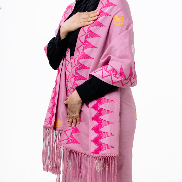 Makna Motif: Motif Bungong Peut Ulah atau bunga empat segi menggambarkan keindahan yang simetris dan seimbang. Di balik bentuknya yang sederhana, motif ini menyimpan makna spiritual yang mendalam. Empat kelopak bunga yang mengarah ke empat penjuru mata angin menjadi simbol bahwa ke mana pun manusia melangkah atau memandang, di sanalah keberadaan Sang Khalik, Tuhan Yang Maha Esa, senantiasa menyertai. Ini adalah pengingat akan kehadiran Ilahi dalam setiap aspek kehidupan. Sementara itu, motif Pucok Reubong terinspirasi dari bentuk pucuk bambu—tanaman yang tumbuh subur dan banyak ditemukan di Aceh. Bambu dikenal kuat, lentur, dan terus bertunas, sehingga dijadikan simbol pertumbuhan, harapan, dan ketahanan hidup. Motif ini merepresentasikan perjalanan hidup manusia sejak lahir, tumbuh dewasa, hingga menua, dengan harapan agar manusia terus berkembang dalam kebijaksanaan, kebaikan, dan kebermanfaatan bagi lingkungan sekitarnya. Kedua motif ini, ketika dipadukan, menjadi refleksi tentang hubungan spiritual manusia dengan Tuhannya, serta perjalanan hidup yang senantiasa bergerak menuju kematangan jiwa dan kesempurnaan akhlak.