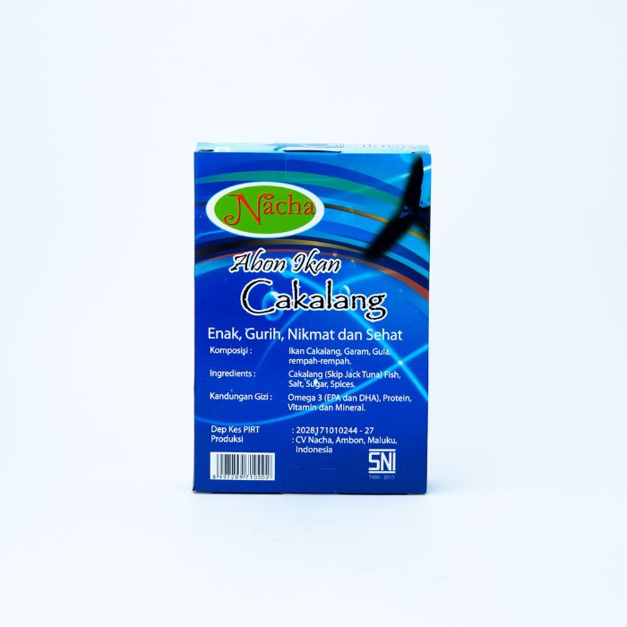 Nacha menghadirkan Abon Ikan Cakalang yang berasal dari Ambon, Propinsi Maluku. Memiliki kandungan gizi, protein dan omega 3 (EPA-DHa). Menggunakan ikan cakalang segar dari perairan Maluku, tanpa bahan pengawet dengan proses higienis dan aman.