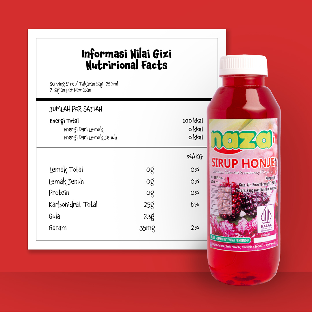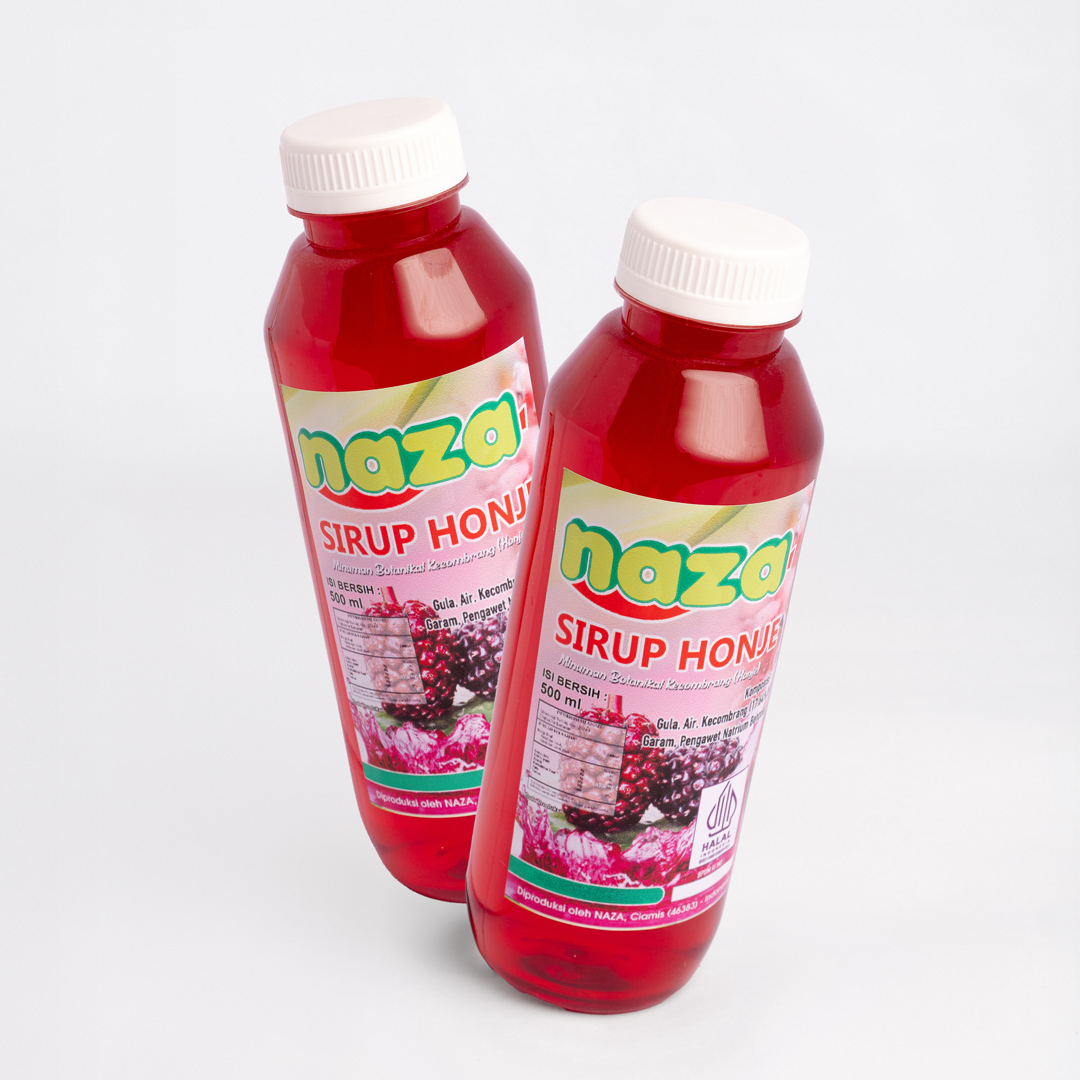 Naza Sirup Honje adalah minuman yang berasal dari buah tanaman kecombrang. Memiliki warna merah yang cantik serta memiliki rasa dan aroma yang khas. Rasa asam dari minuman ini sangat pas sekali tidak terlalu asam sehingga sangat cocok untuk dikonsumsi di siang hari. Sirup Honje dapat di komsumsi dengan menggunakan air hangat maupun air dingin. Lebih enak di sajikan dengan air dingin.