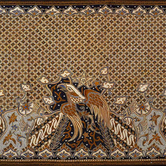 Makna Motif: Elang jawa dianggap identik dengan sang garuda lambang negara. Sejak 1992 ia ditetapkan sebagai maskot satwa langka Indonesia. Merupakan fauna endemik pulau Jawa, kegagahan dan keanggunannya sungguh mempesona. New Exotic mengabadikan anggota ekosistem hutan hujan tropis ini demi mengabarkan pentingnya melestarikan lingkungan. Diperindah dengan motif klasik ‘kawung’, karya seni ini memancarkan kebebasan dan kepercayaan diri.