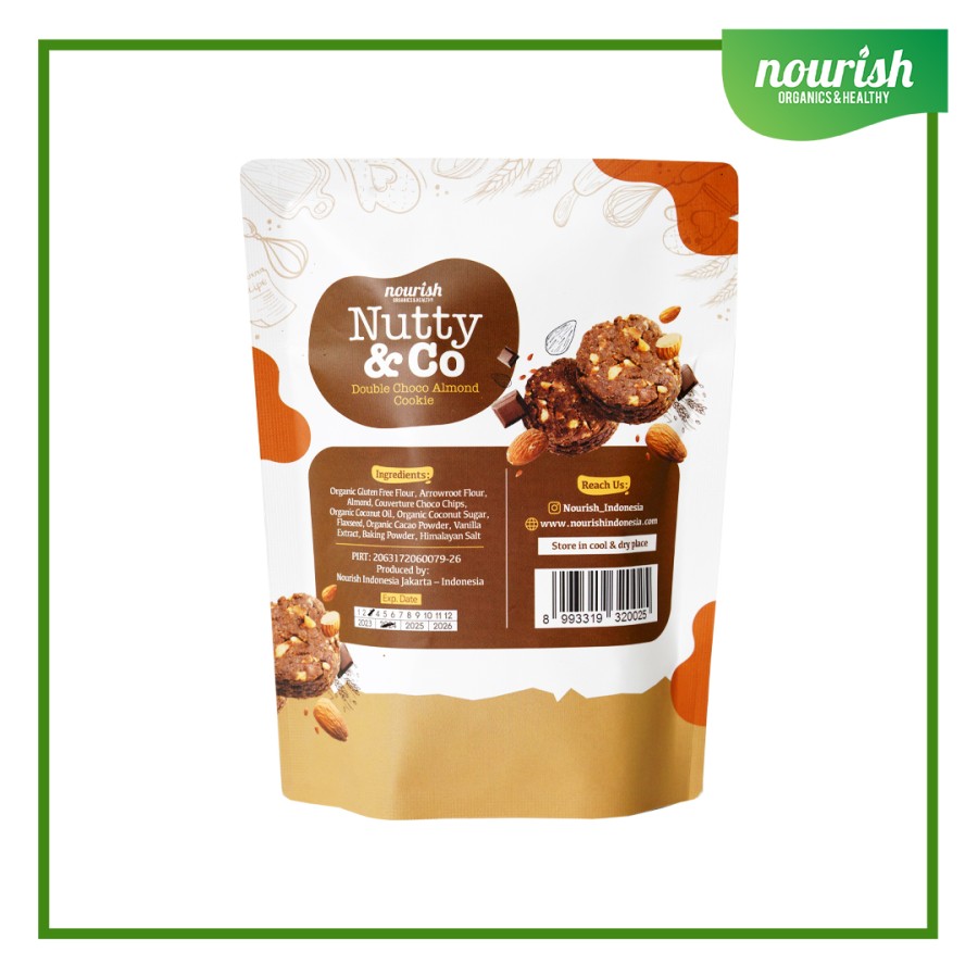Kandungan Bahan: Organic Gluten Free Flour, Organic Arrowroot Flour, Almond, Couverture Choco Chips, Organic Coconut Oil, Organic Coconut Sugar, Flaxseed, Organic Cacao Powder, Vanilla Extract, Baking Powder, Himalayan Salt