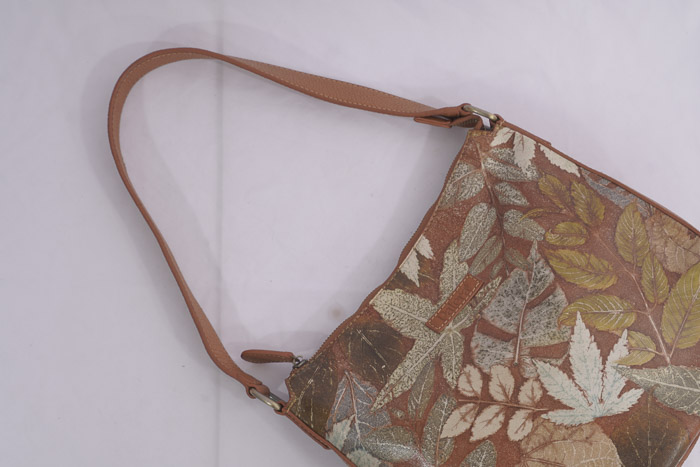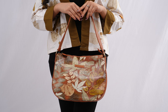 tas bahu dengan bahan full kulit,kulit domba yg di motif dgn tehnik ecoprint n pewarna alami