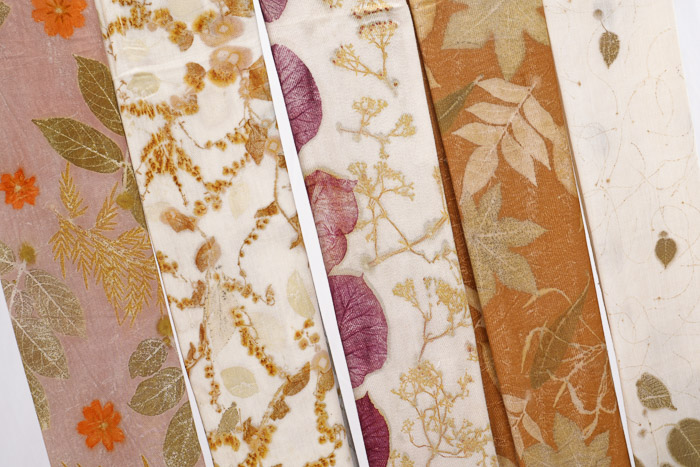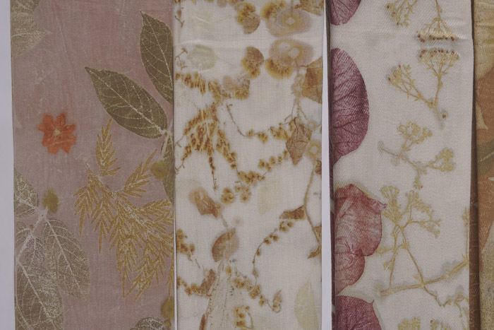 Selendang tenun atbm(alat tenun bukan mesin) berbahan serat alam, di motif dengan tehnik ecoprint memanfaatkan dedaunan sekitar.