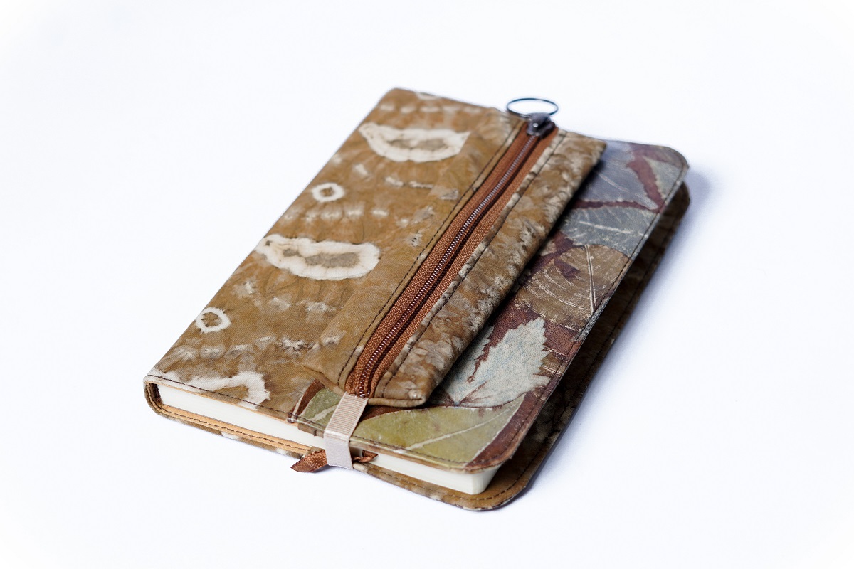 Noted Book dan Kotak Pensil Kombinasi mewah dari kulit dan kain bermotif jumputan khas Sumatera Selatan dan motif alami Ecoprint