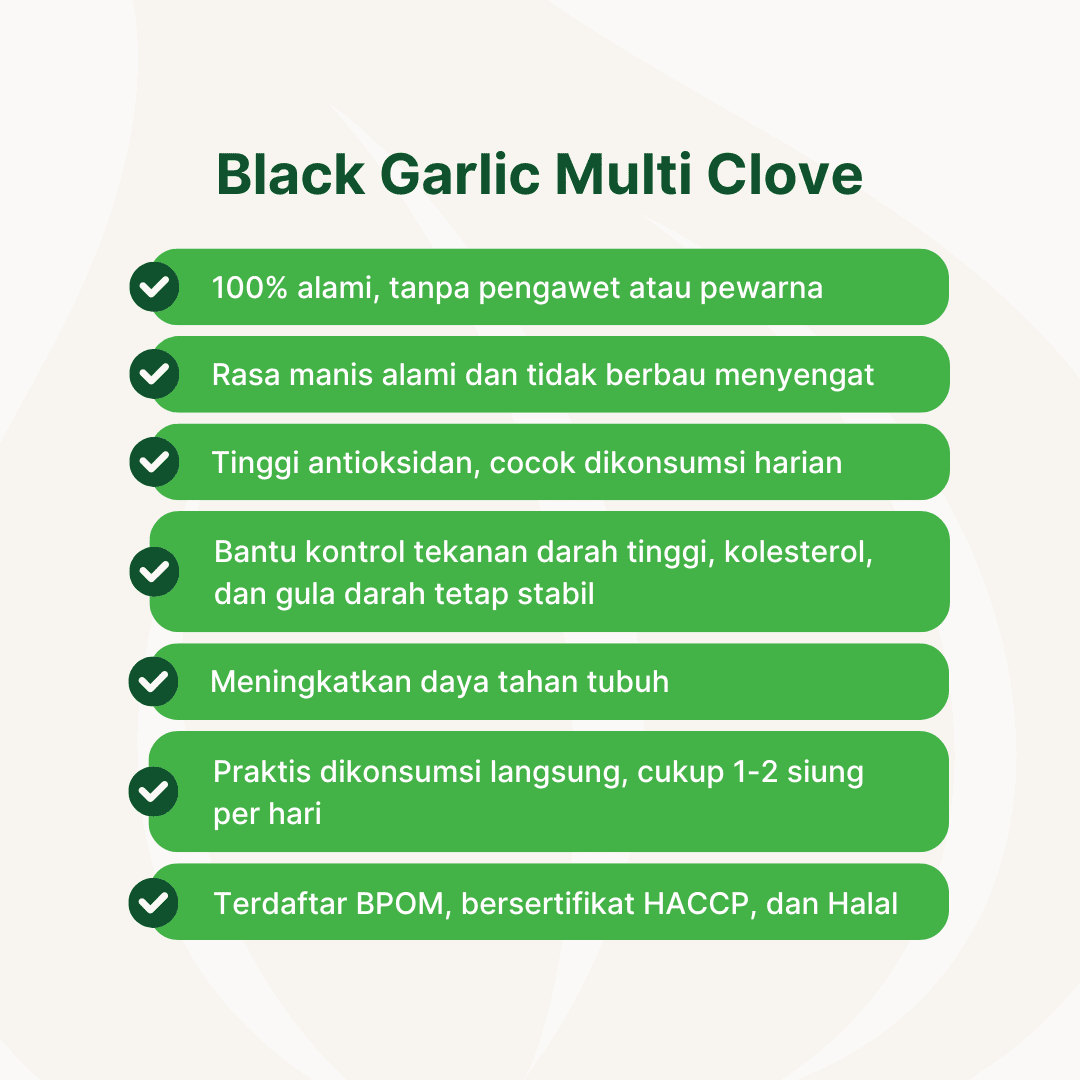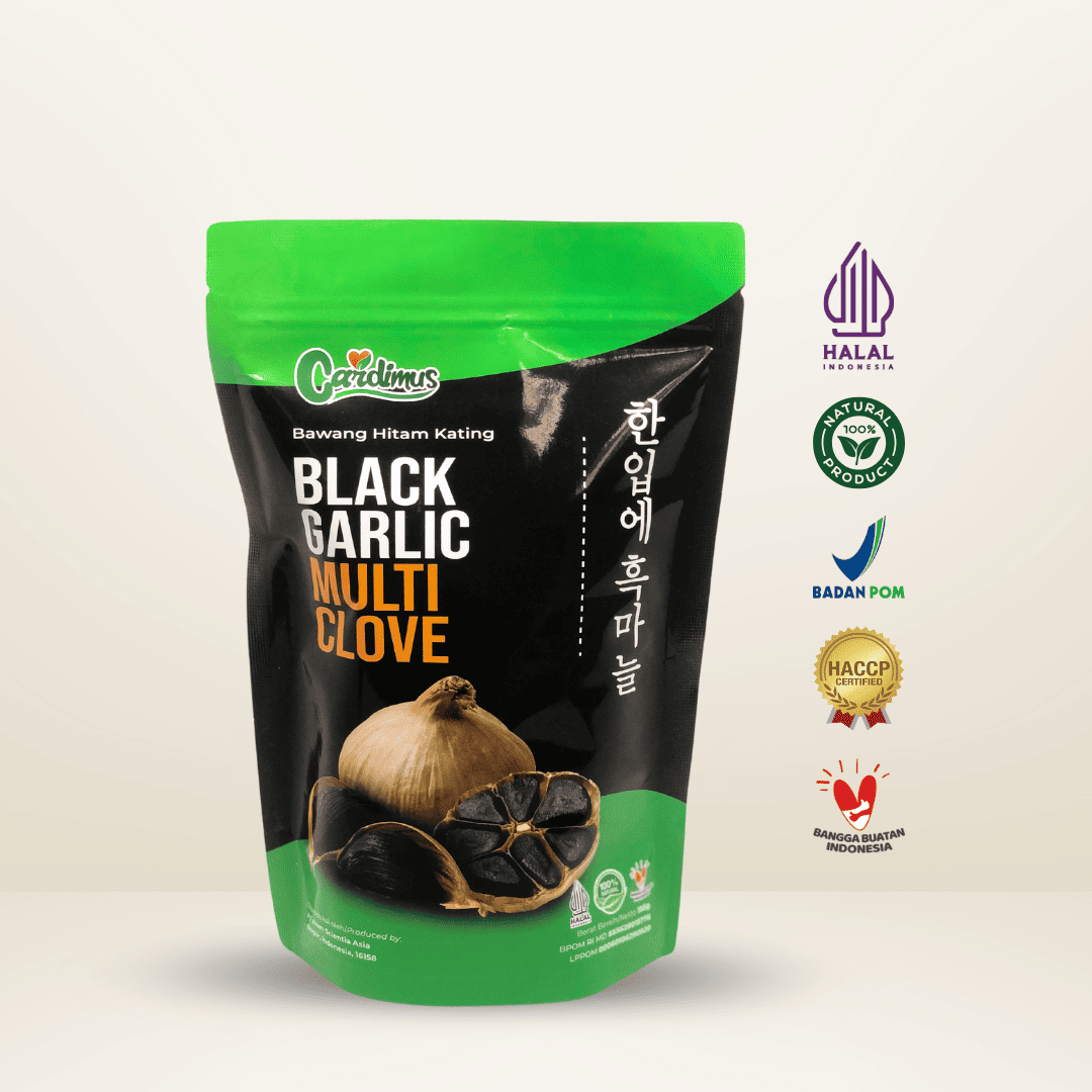 CARDIMUS BLACK GARLIC MULTI CLOVES merupakan bawang putih kating yang difermentasi dengan menggunakan mesin khusus melalui Reaksi Maillard. Memiliki tekstur yang kenyal, rasa asam, manis dan sedikit pahit. Black Garlic mengandung senyawa S-allyl cysteine (SAC), komponen flavonoid, dan asam amino yang memiliki kemampuan sebagai antioksidan tinggi dan baik untuk kesehatan jantung. Bawang Hitam juga memiliki fungsi manfaat sebagai anti kanker, anti alergi, anti inflamasi, anti diabetes dan obesitas, hepatoprotektif dan neuroprotektif.