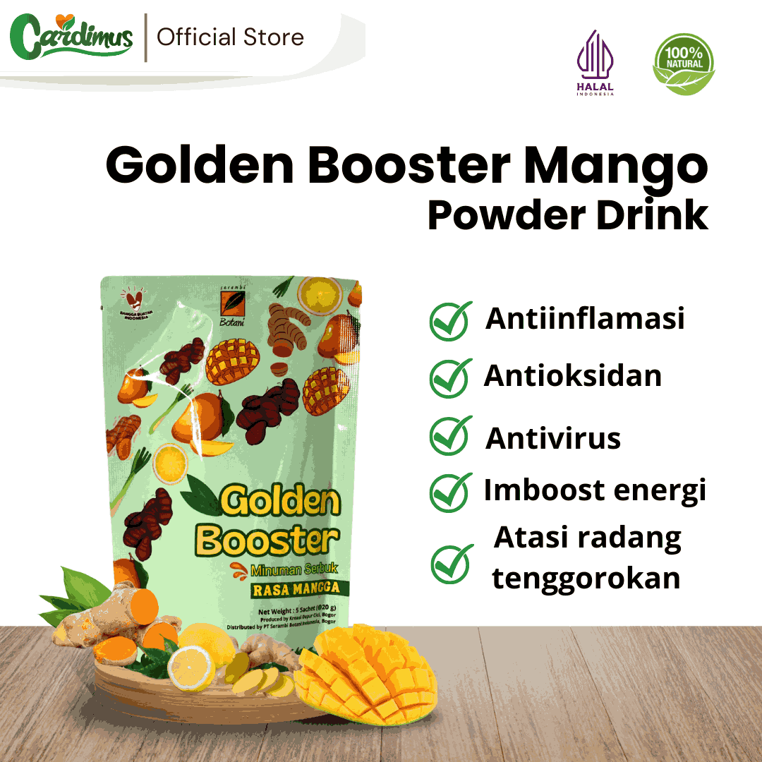 - Golden Booster Mango merupakan minuman serbuk instan yang berasal dari perpaduan herbal berkhasiat seperti ekstrak kunyit, ekstrak jahe merah, ekstrak temulawak, ekstrak lemon dengan rasa mangga yang menyegarkan.