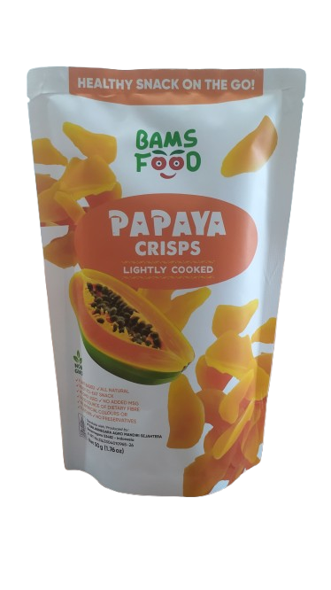 Bams food Keripik pepaya menjadi salah satu keripik yang diolah dari pepaya pilihan dan minyak sawit pilihan yang menghasilkan keripik yang manis, renyah, gurih, higienis, dan sehat.