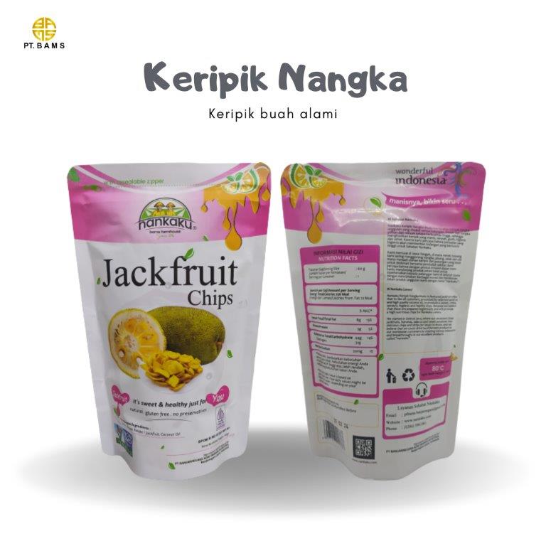 Terbuat dari buah nangka, diproses dengan teknologi vacuum frying (suhu 80ᵒC) menggunakan minyak kelapa untuk mempertahankan rasa, kualitas dan nutrisi buah nangka.