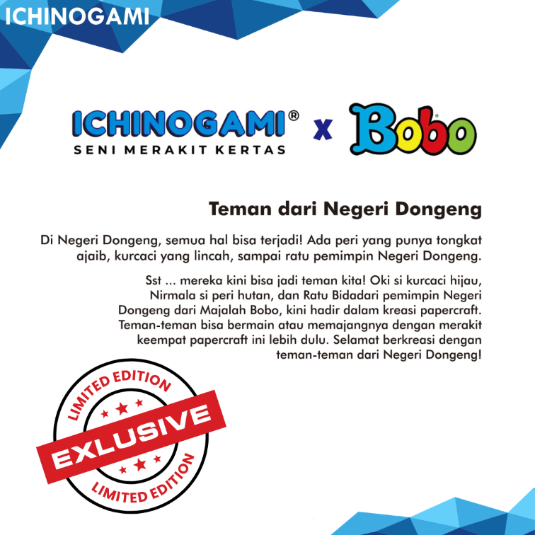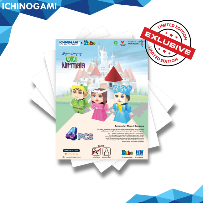 Masuki dunia dongeng Majalah Bobo dengan Papercraft Ichinogami Negeri Dongeng Bobo! Ini adalah hasil kerja sama khusus antara Ichinogami dan Majalah Bobo, menghadirkan 4 papercraft karakter favorit: Nirmala, Oki, Ibu Peri, dan Kastil Negeri Dongeng. Sempurna untuk penggemar Bobo, anak-anak, atau siapa saja yang ingin menciptakan kembali keajaiban dongeng. Merakitnya sangat sederhana karena semua bagian sudah terpotong presisi! Anda hanya perlu menyiapkan lem kertas.