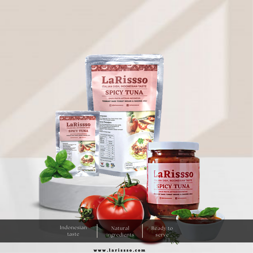 Saus Pasta Spicy Tuna LaRissso merupakan saus pasta varian pedas yang terbuat dari bahan-bahan alami yaitu tomat segar yang dipanen langsung dari para petani, ditambah dengan isian serpihan daging ikan tuna, kemudian dimasak menggunakan minyak canola ditambah dengan bumbu-bumbu juga perpaduan Italian herbs dan rempah lokal sehingga menciptakan rasa yang asam, segar, gurih dan sedikit pedas. Selain pasta saus ini juga cocok untuk olesan roti, pizza, cocolan kentang goreng, nachos, bahkan juga bias digunakan sebagai bumbu nasi goreng.