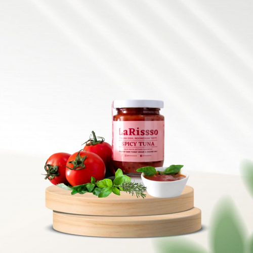 Saus Pasta Spicy Tuna LaRissso merupakan saus pasta varian pedas yang terbuat dari bahan-bahan alami yaitu tomat segar yang dipanen langsung dari para petani, ditambah dengan isian serpihan daging ikan tuna, kemudian dimasak menggunakan minyak canola ditambah dengan bumbu-bumbu juga perpaduan Italian herbs dan rempah lokal sehingga menciptakan rasa yang asam, segar, gurih dan sedikit pedas. Selain pasta saus ini juga cocok untuk olesan roti, pizza, cocolan kentang goreng, nachos, bahkan juga bias digunakan sebagai bumbu nasi goreng.
