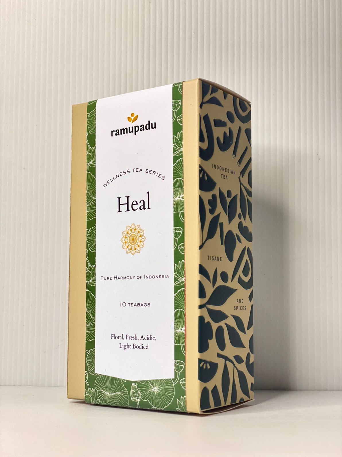 Heal, teh bebas kafein memiliki kandungan antioksidan tinggi dan prebiotik yang baik untuk pencernaan. Teh ini dapat dikonsumsi kapanpun, dari pagi hingga malam hari dan disajikan hangat maupun dingin. Heal memiliki rasa yang segar sedikit asam dan sekilas manis dari bunga.