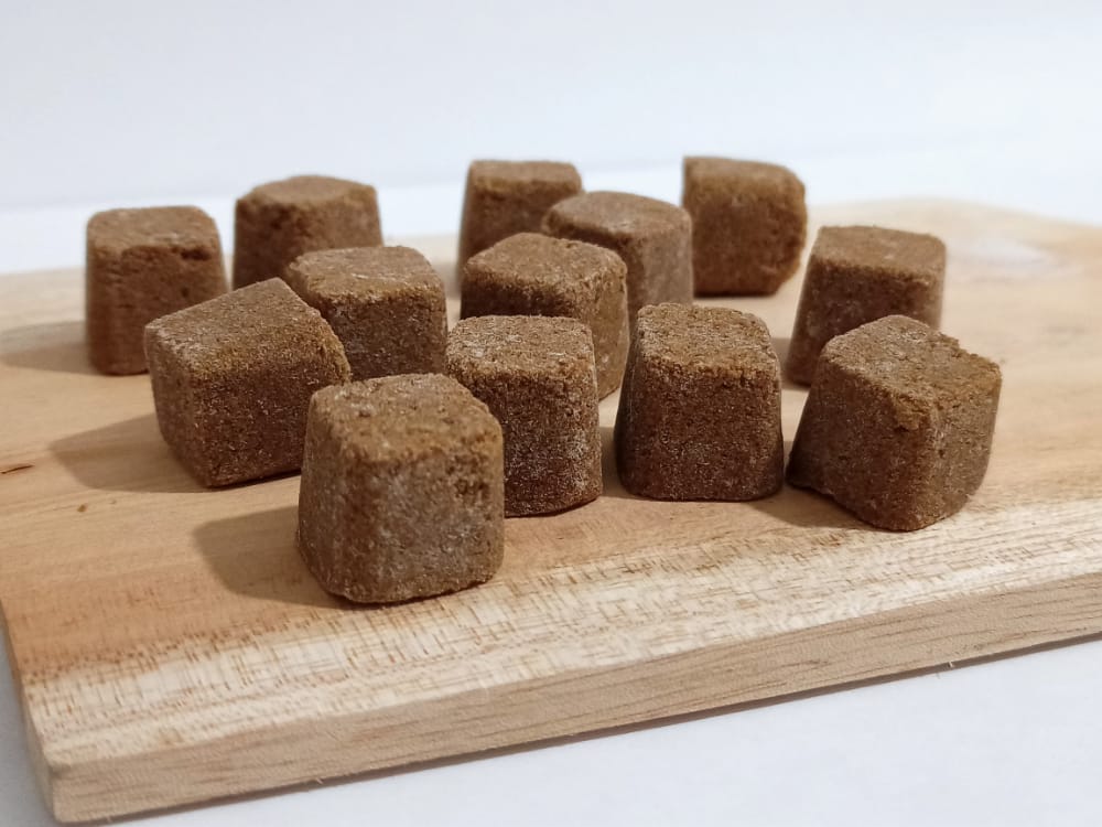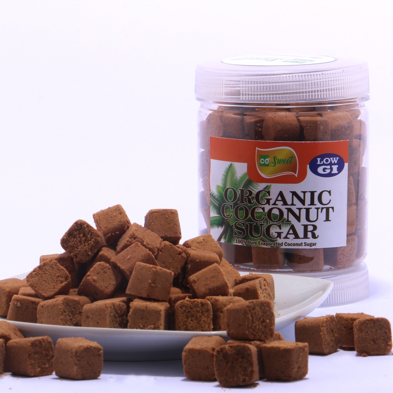 Gula kelapa cube (gula semut cube) organik terbuat dari nira kelapa murni tanpa bahan campuran gula pasir dan tidak menggunakan bahan kimia