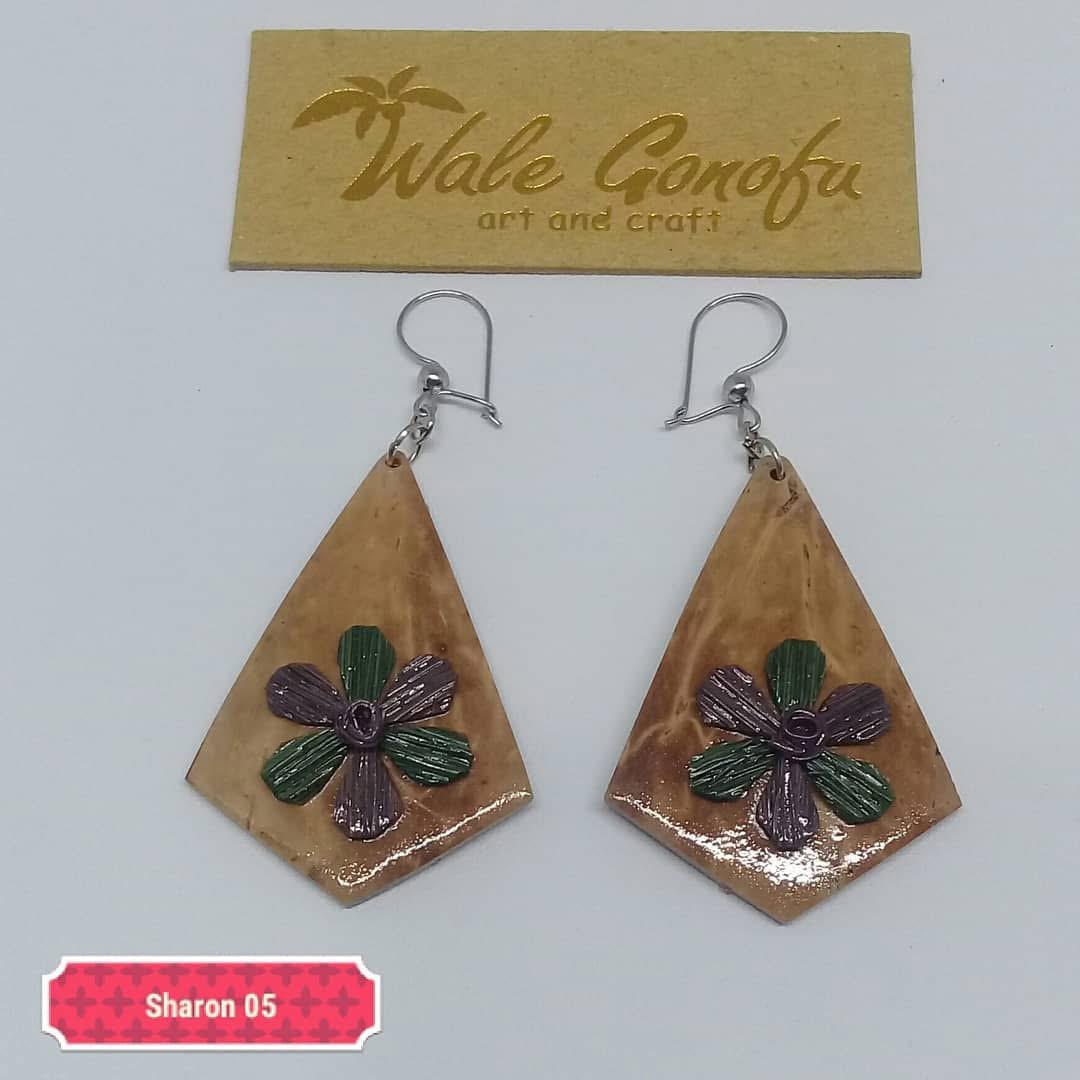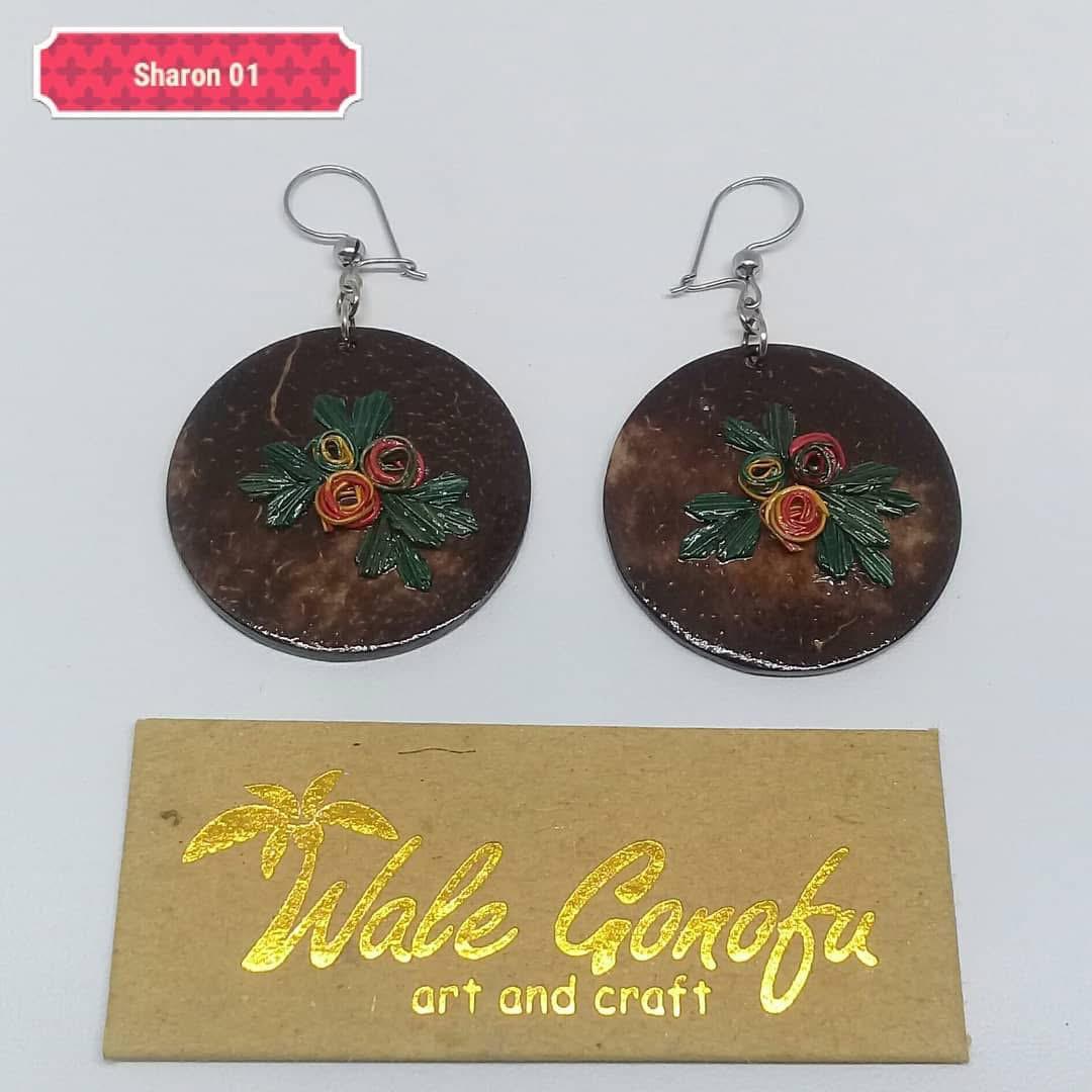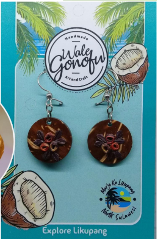 Anting anting unik dari batok kelapa berhias bungan dari sabut kelapa yang telah diproses.