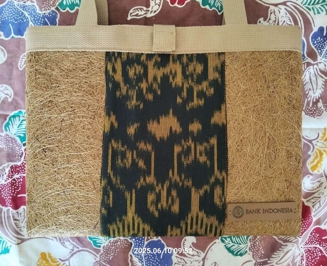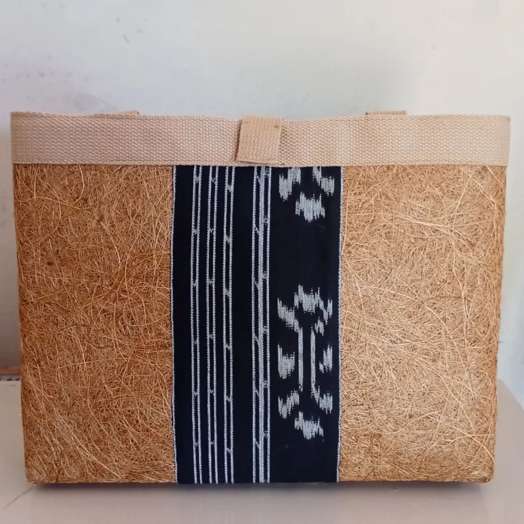 Tas unik dan alami dari sabut kelapa dengan lem alami. Memanfaatkan limbah perca kain tenun khas Sulawesi Utara.
